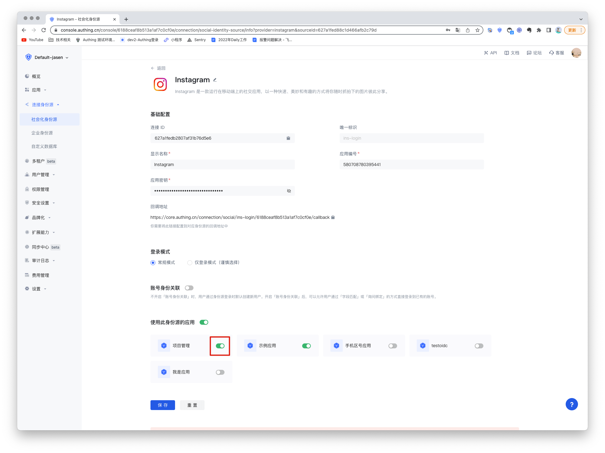 3.2 在已创建好的 Instagram 身份源连接详情页面,开启并关联一个在 Authing 控制台创建的应用