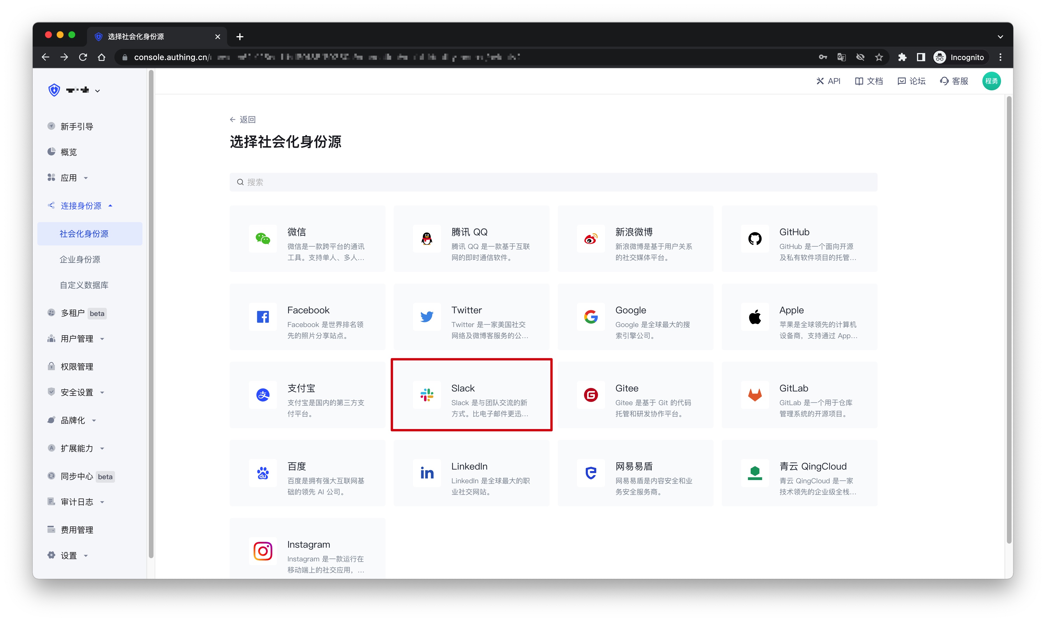 2.2 在「选择社会化身份源」页面,点击「Slack」卡片。