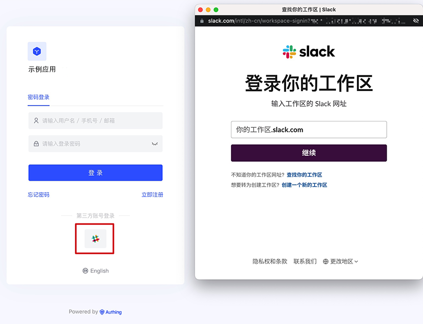 3.3 点击 Authing 控制台的应用「体验登录」按钮,在弹出的登录窗口体验「Slack」登录