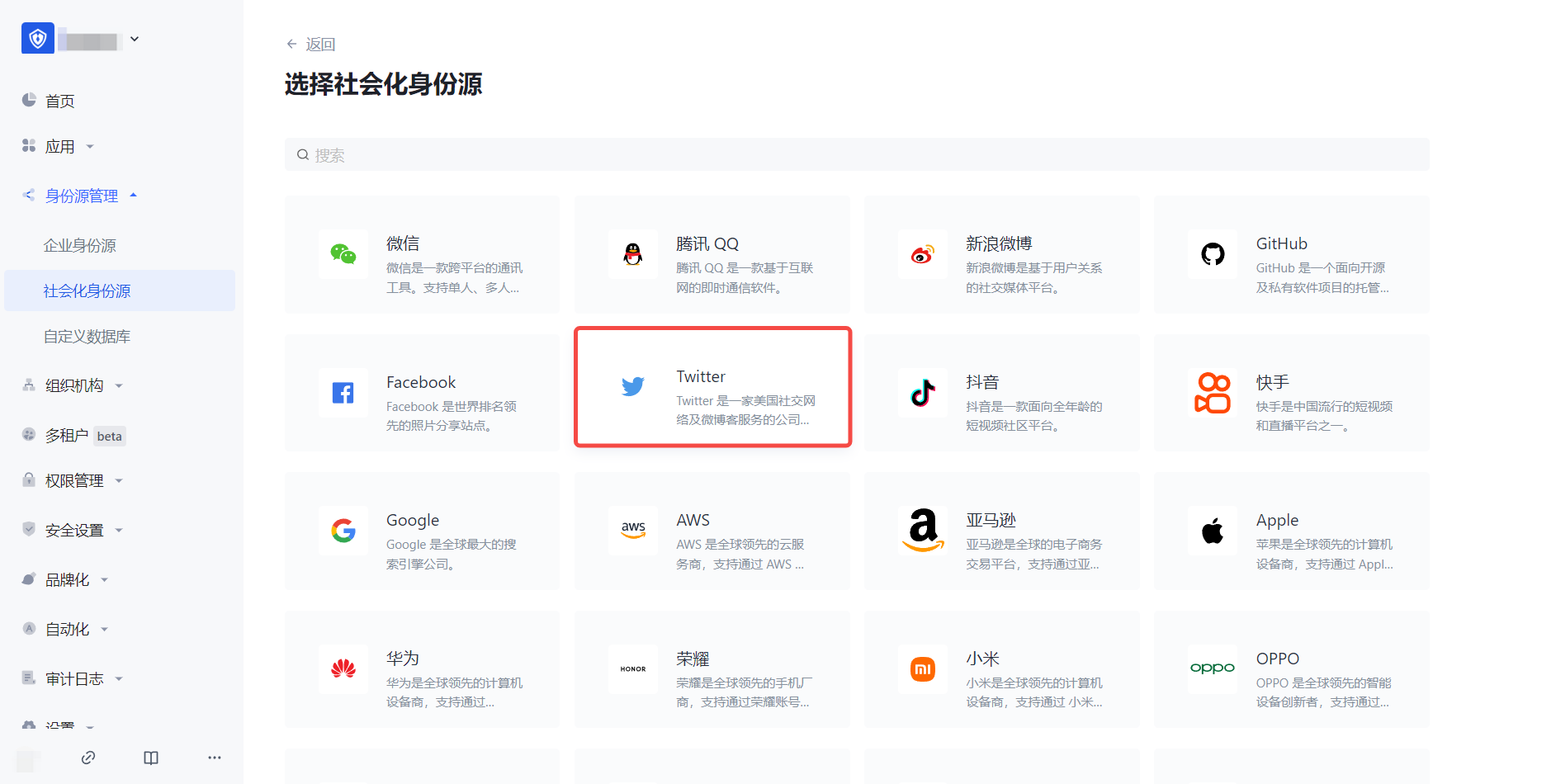 2.1 请在 Authing Console 控制台 的「社会化身份源」页面,点击「创建社会化身份源」按钮,进入「选择社会化身份源」页面,选择「Twitter」身份源按钮,进入 「Twitter 移动端登录模式」页面。