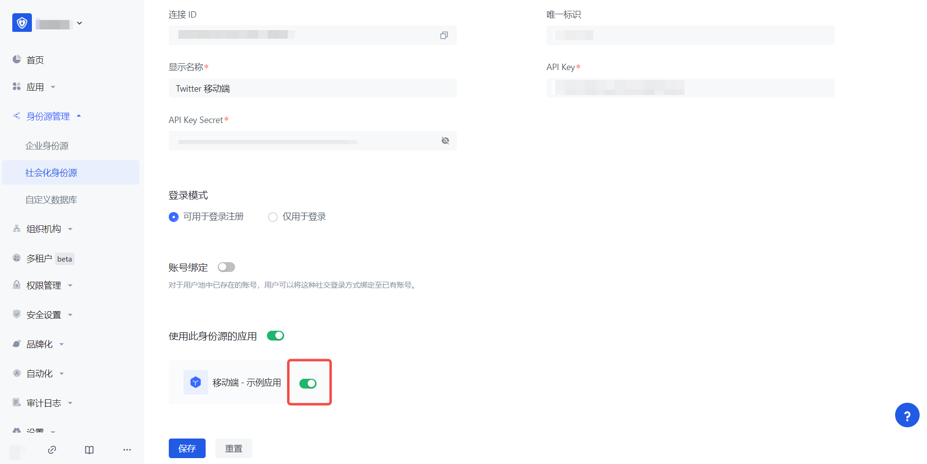 3.2 在已创建好的 Twitter 移动端身份源连接详情页面,开启并关联一个在 Authing 控制台创建的应用