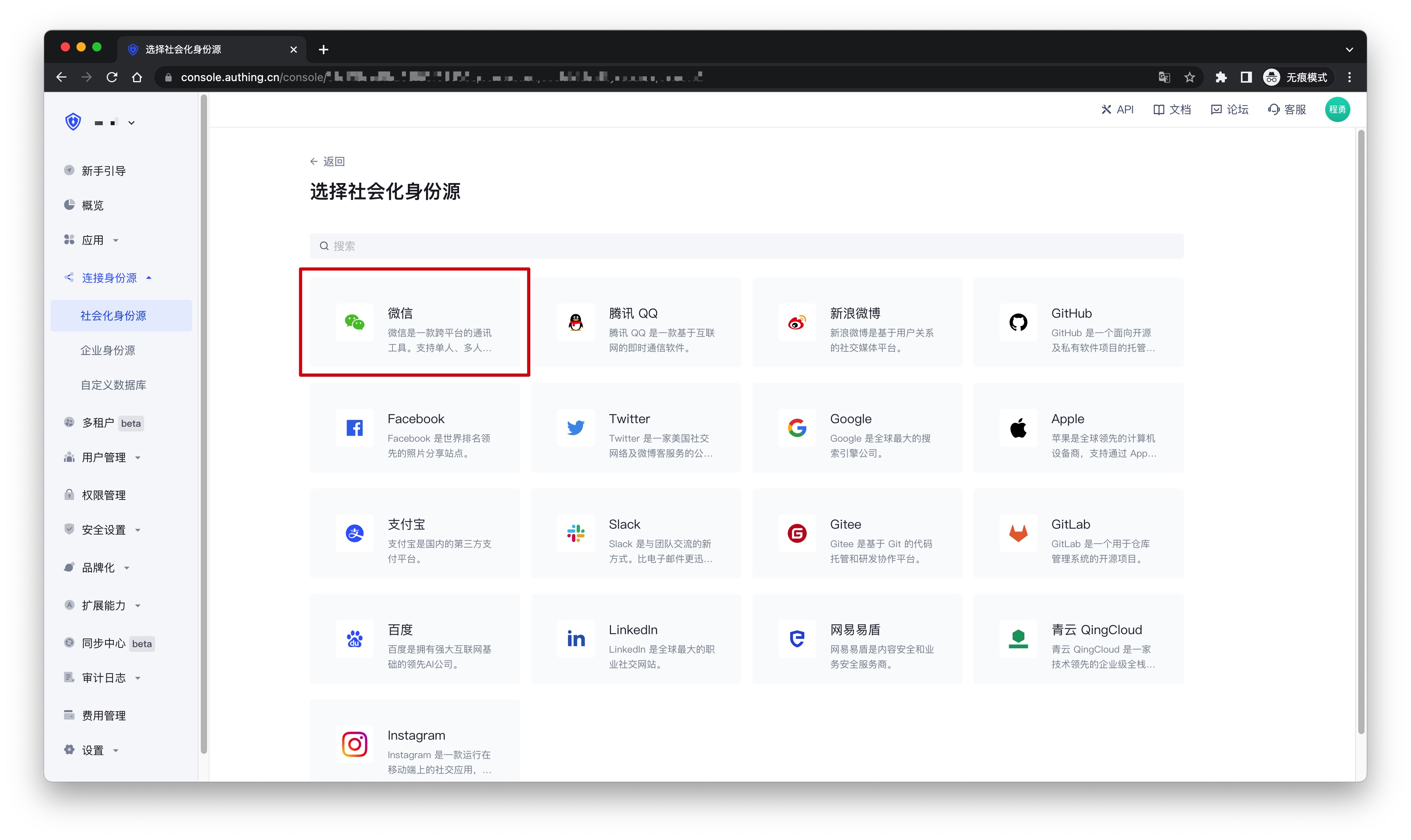 2.1 请在 Authing 控制台的「社会化身份源」页面,点击「创建社会化身份源」按钮,进入「选择社会化身份源」页面。