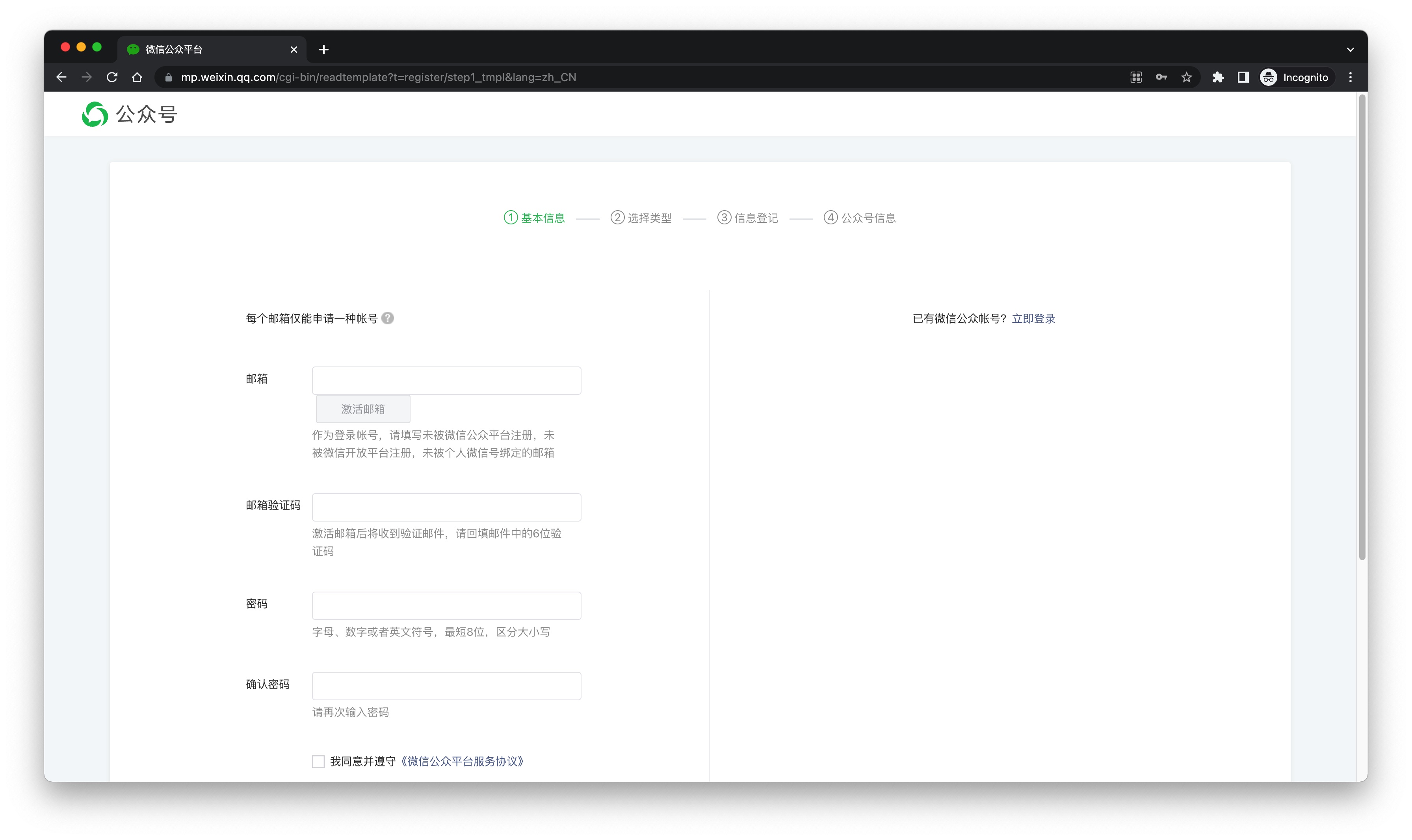 前往 微信公众平台 (opens new window)创建一个 微信服务号。
