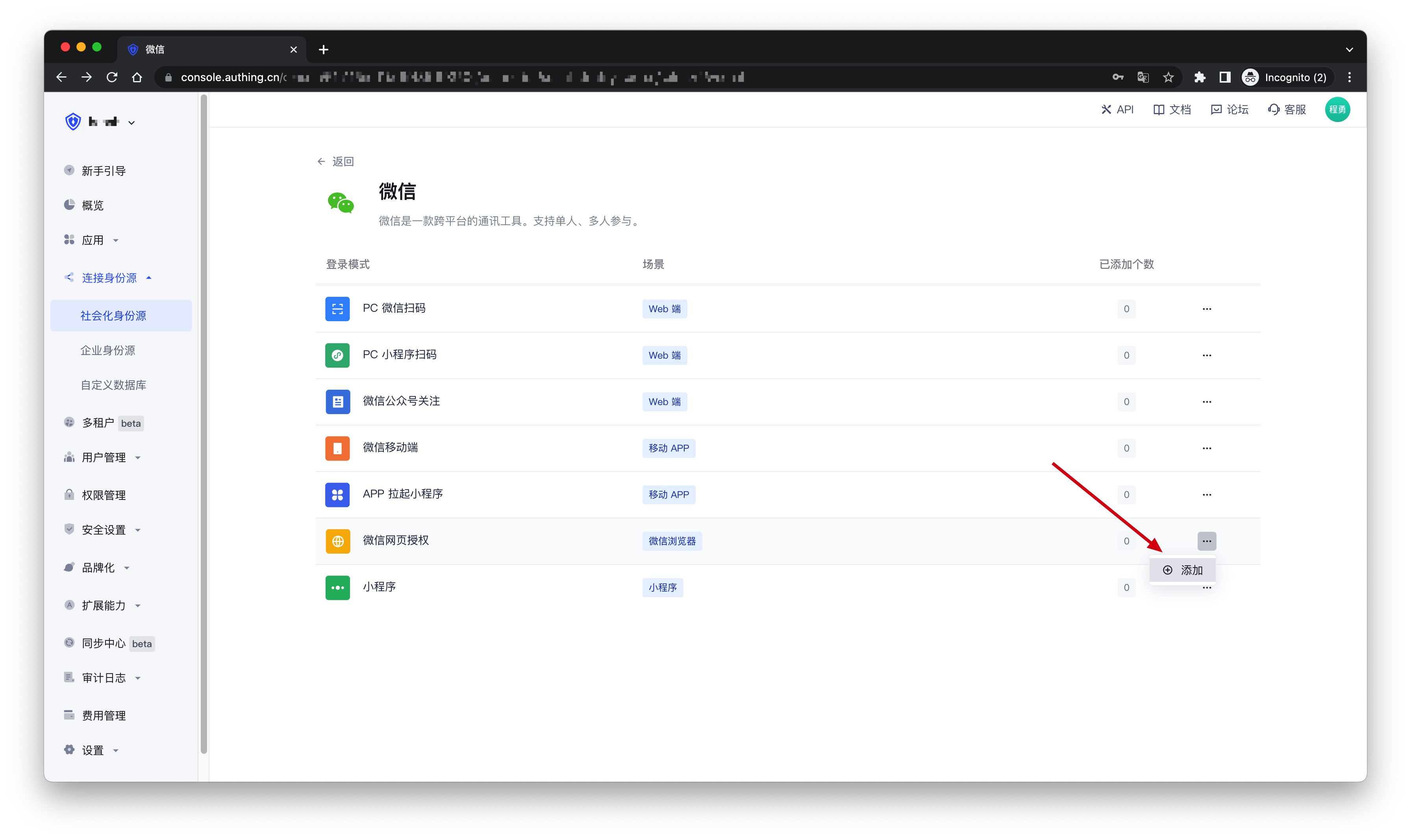 2.3 继续点击「微信网页授权」登录模式,或者点击 … 添加 打开「微信网页授权」配置页面。