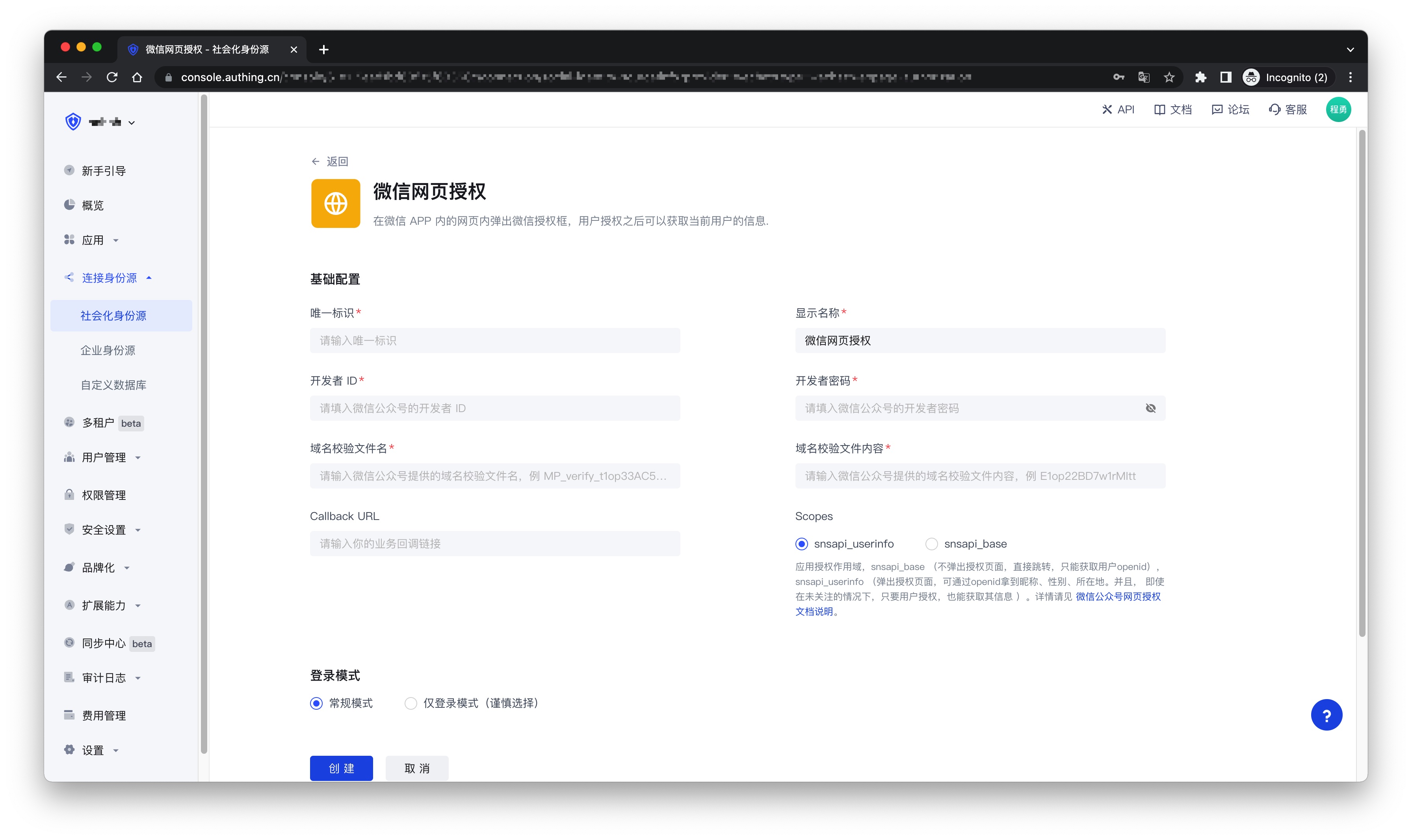 ¶ 第二步:在 Authing 控制台配置微信网页授权应用
