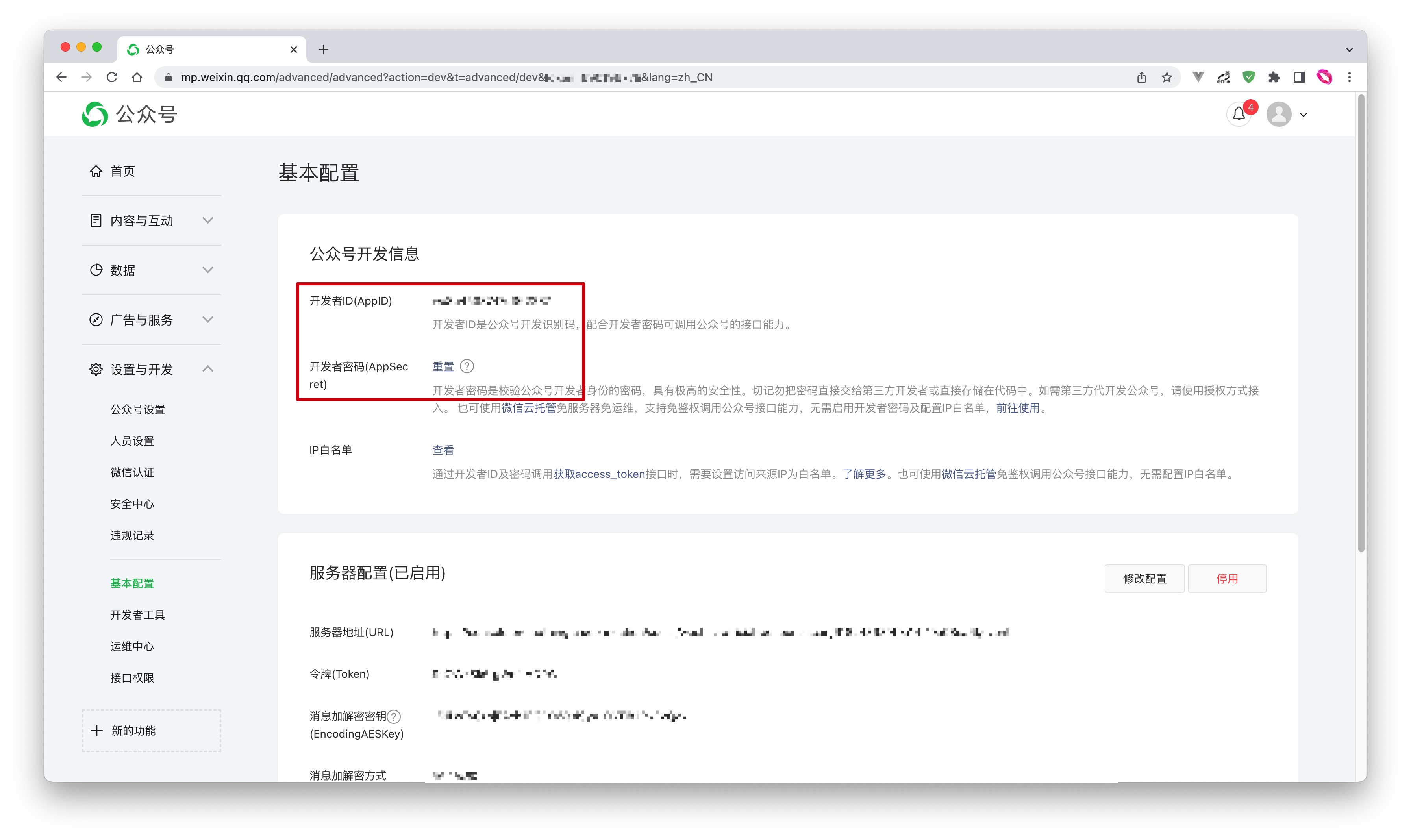 你可以在微信公众平台后台的 设置与开发 -> 基本配置 页面获取 开发者 ID(AppID) 和 开发者密码(AppSecret),后面步骤2会用到。