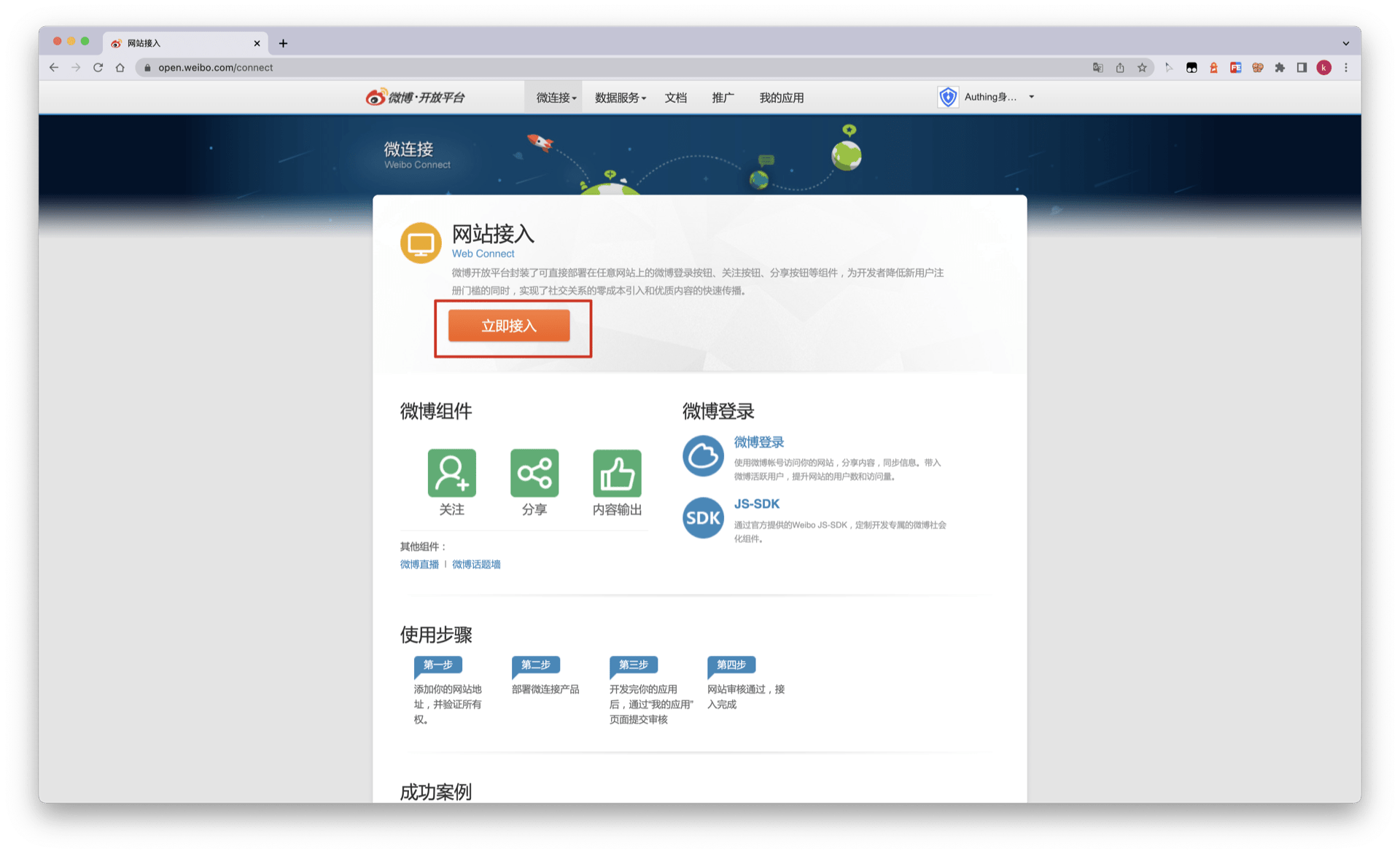 点击页面右上方头像图标,选择开发者信息进行基本信息和身份认证,认证通过后创建一个网站应用。如有无法解决的问题可私信微博开放平台 (opens new window)咨询。