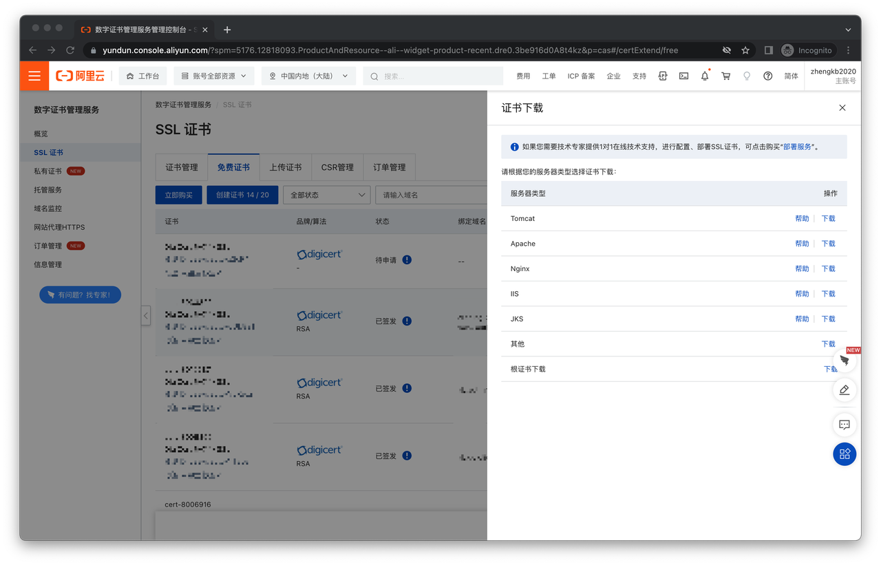 ¶ 第一步:下载域名对应的证书