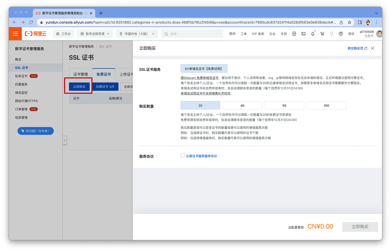 如果你还没有证书,可以点击 立即购买 生成新的证书。