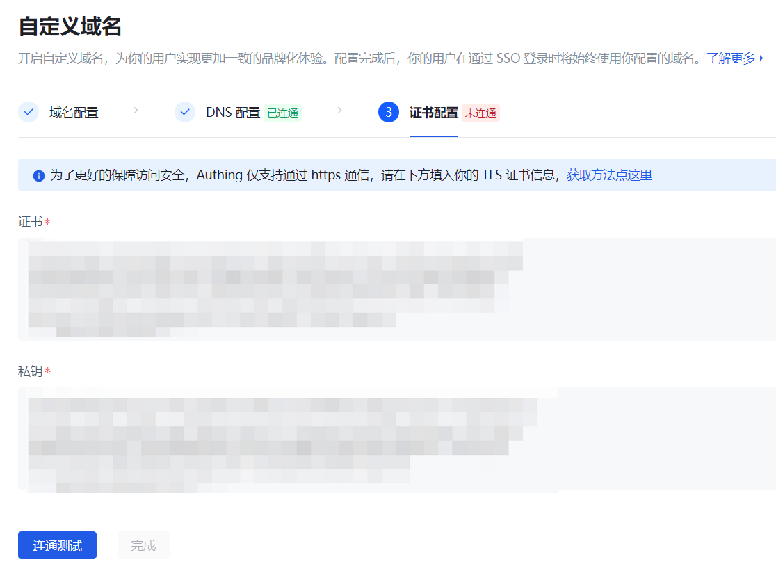 将有效的证书信息填入 Authing 的 SSL 证书配置区域之后,即可进行连通测试。Authing 会对证书和域名之间的匹配以及证书的有效期进行校验,校验通过后 SSL 证书配置即生效。