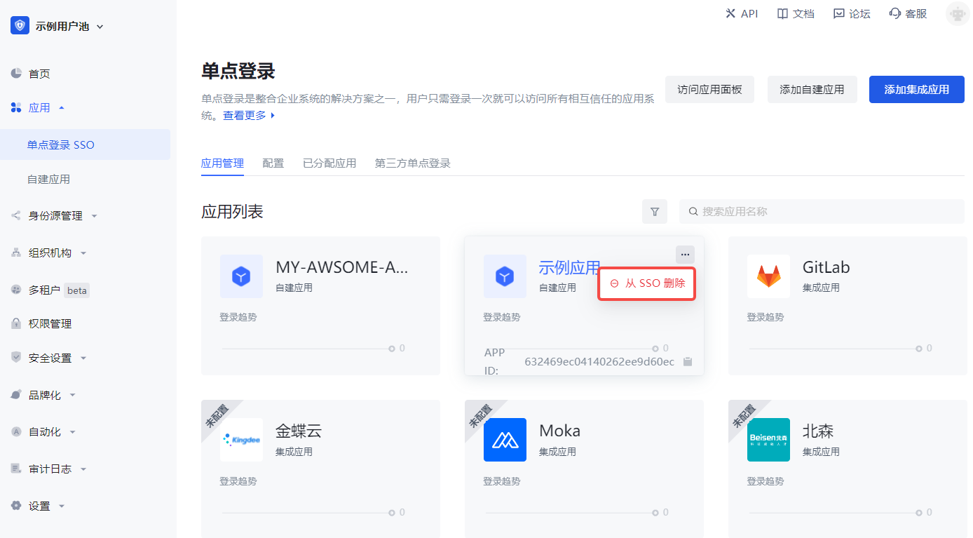用户进入「单点登录 SSO」页,添加刚刚的自建应用。