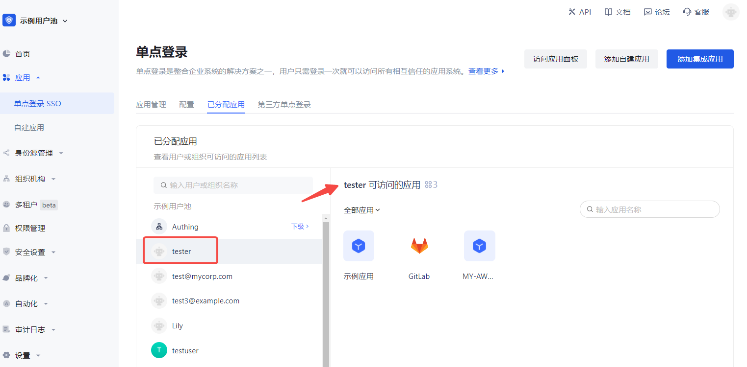管理员可以进入控制台 应用->单点登录 SSO->已分配应用 来查看用户或组织可访问的应用列表。点击应用会进入应用详情页。