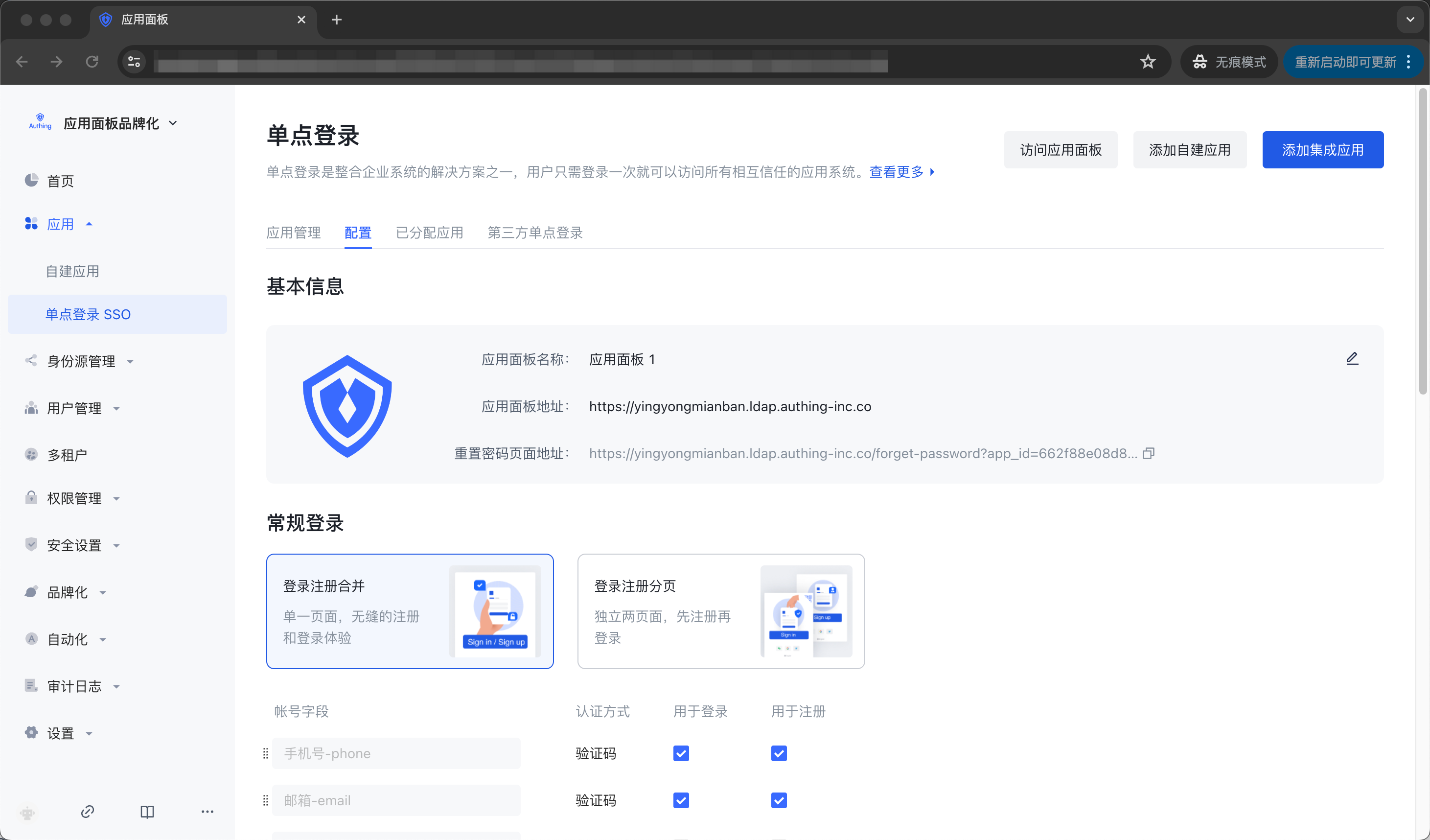 企业管理员或具有 Authing 控制台权限的管理员可以进入控制台 品牌化->应用面板->基础设置 和 应用->单点登录 SSO->配置 来配置应用面板的基本信息、登录注册方式、社交登录方式、企业登录方式等(有关详情,请参阅 登录控制 及 应用面板配置 (opens new window))。