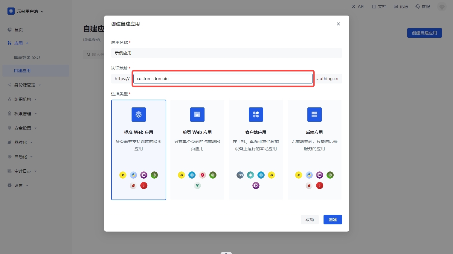 1. 登录 Authing 控制台,创建一个新的应用,并指定应用域名。