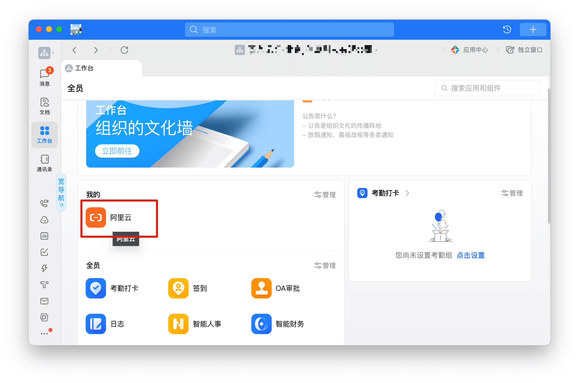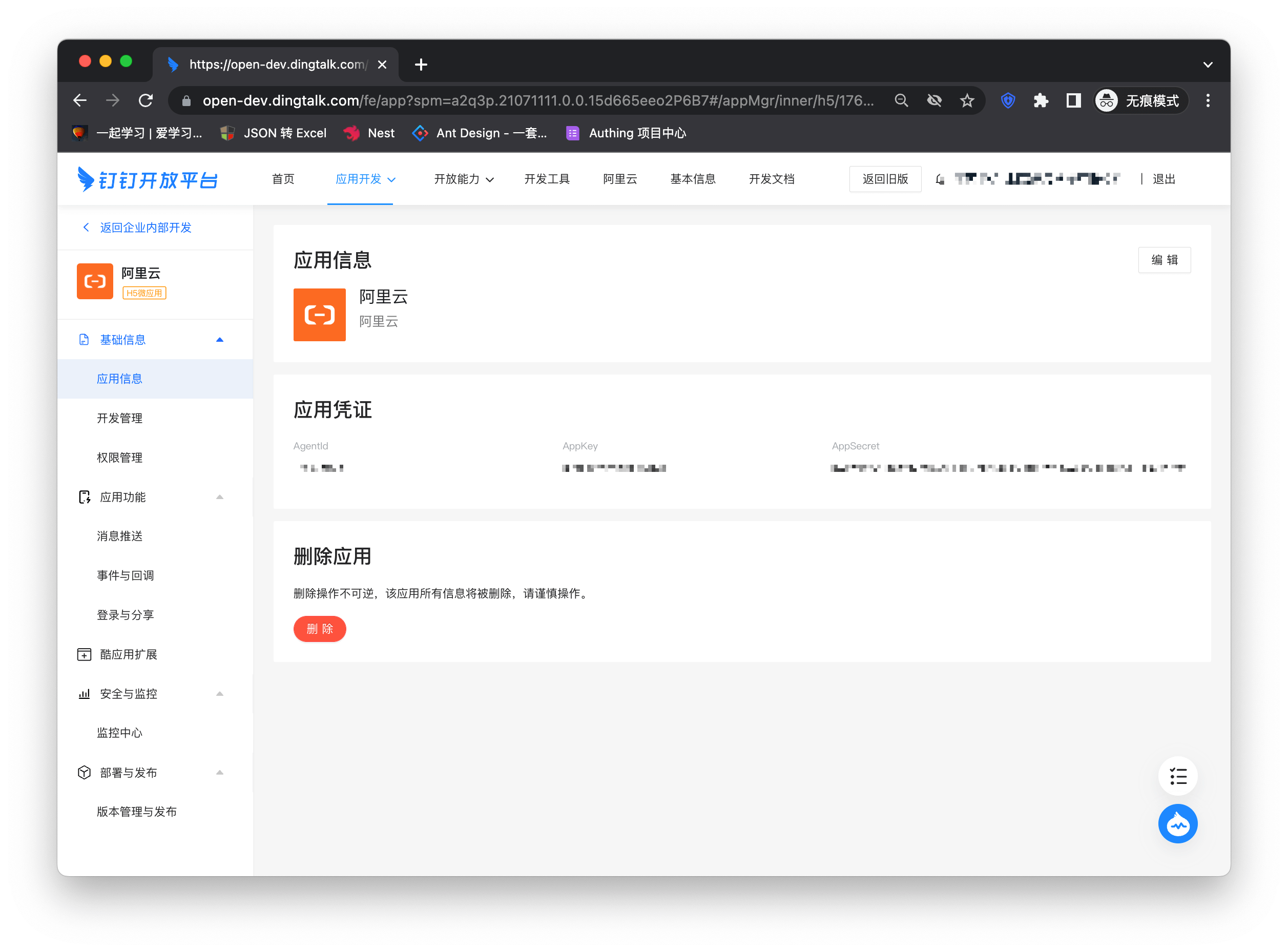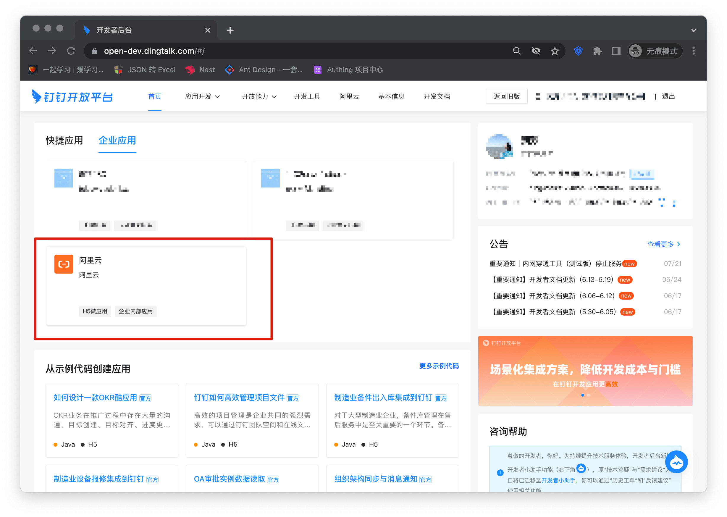 - 进入钉钉开放平台后台 (opens new window),点击顶部 Type 切换到「企业应用」,点击步骤一创建的应用(阿里云)卡片或创建新应用。
