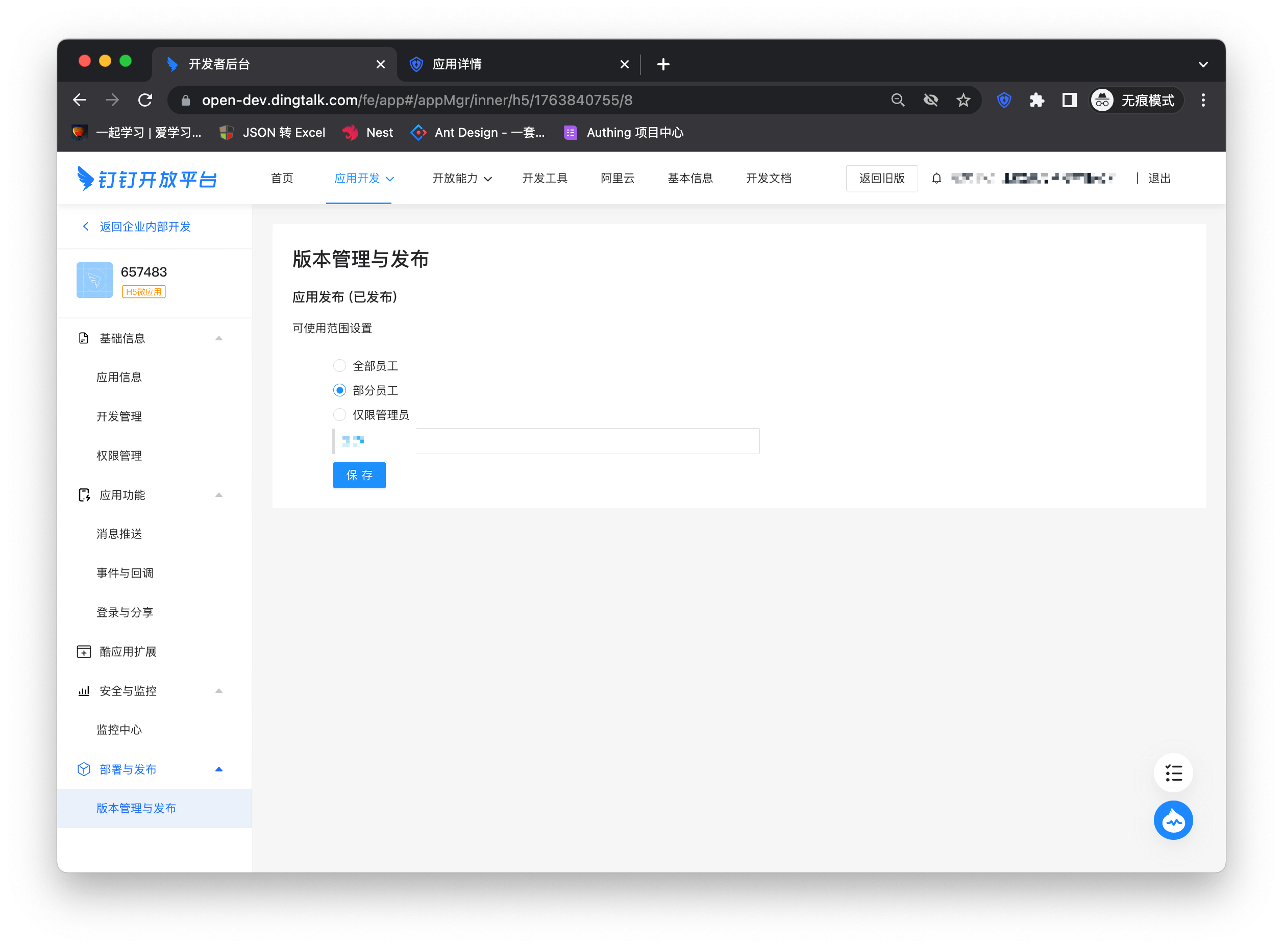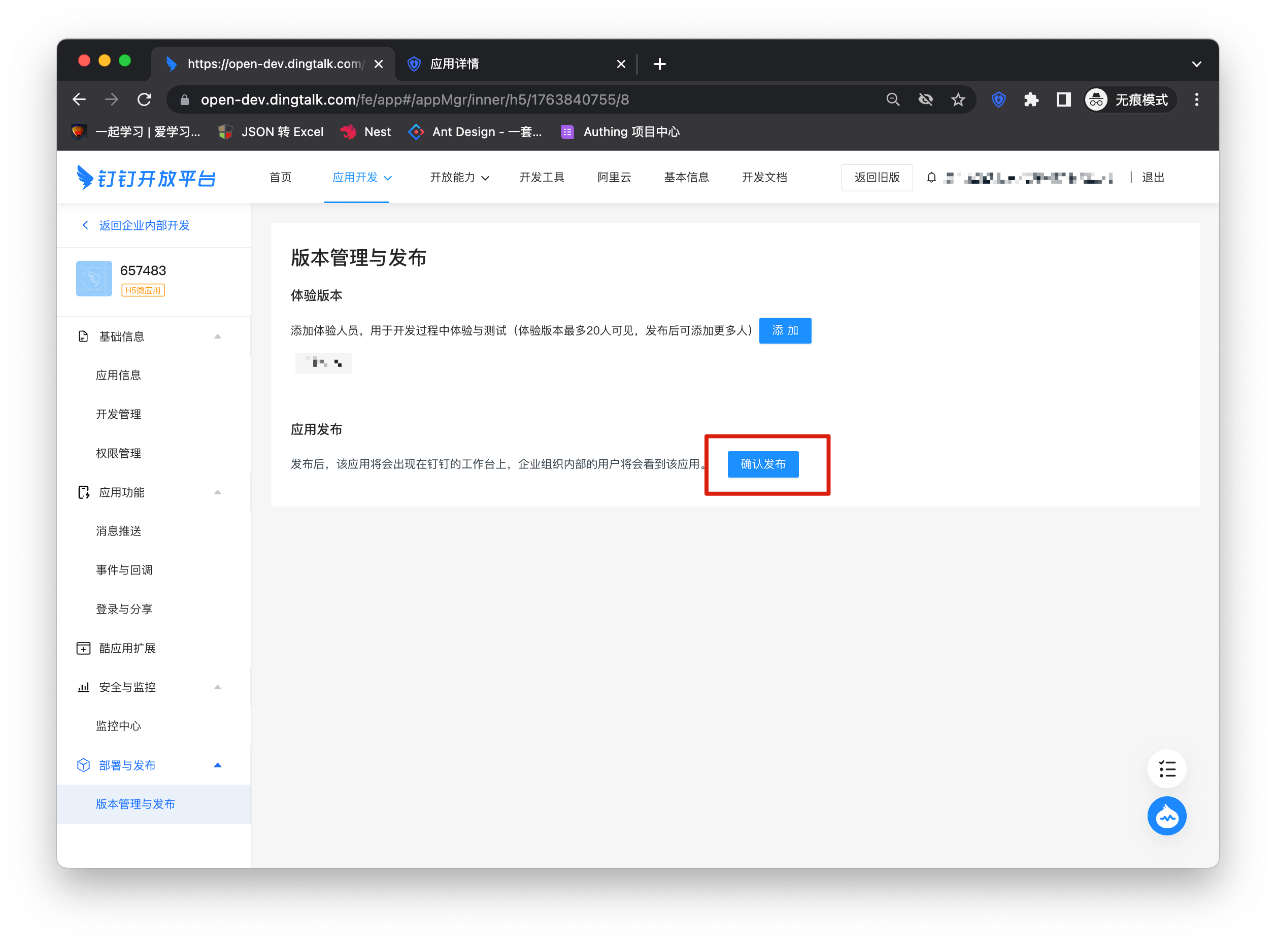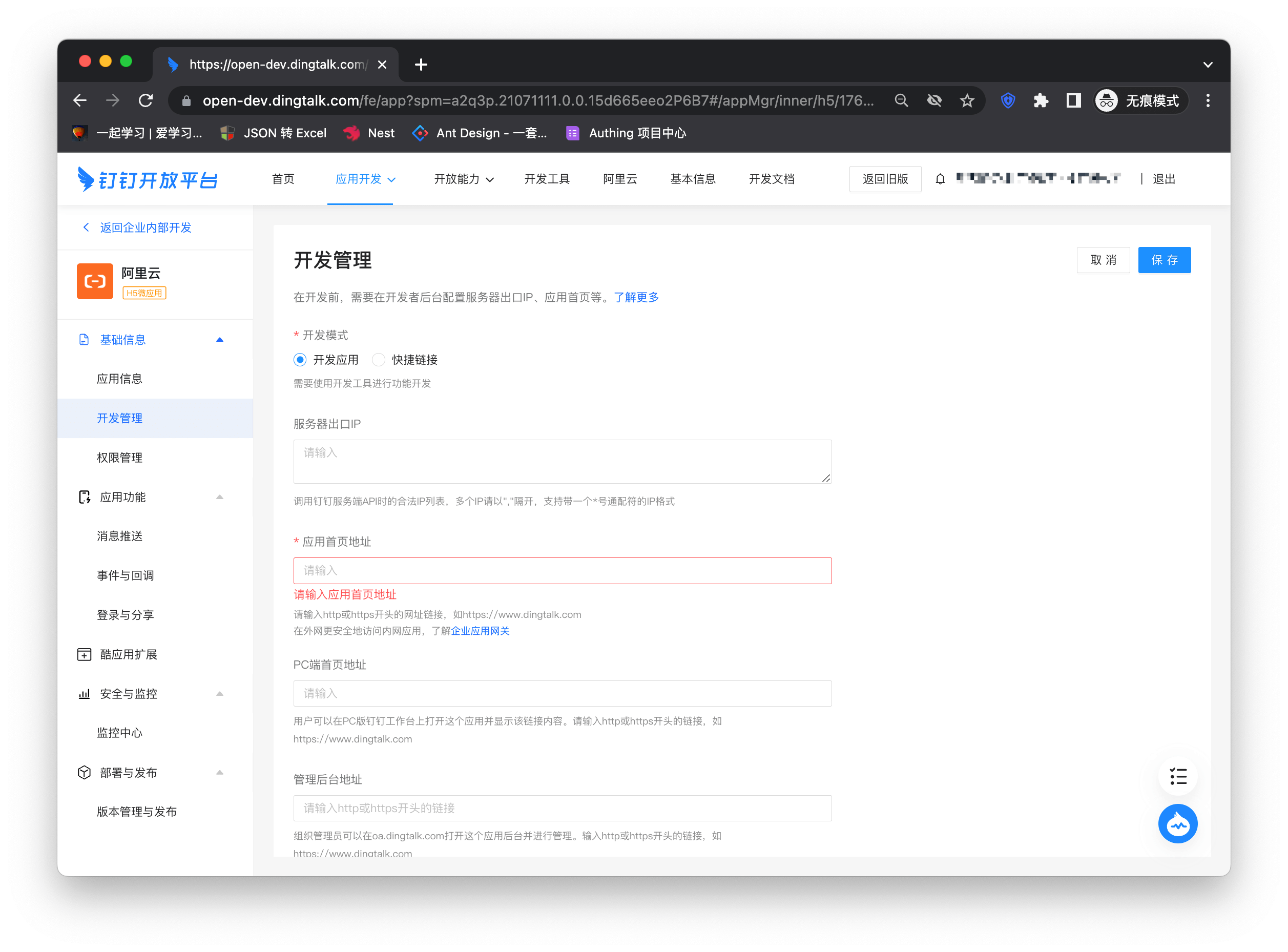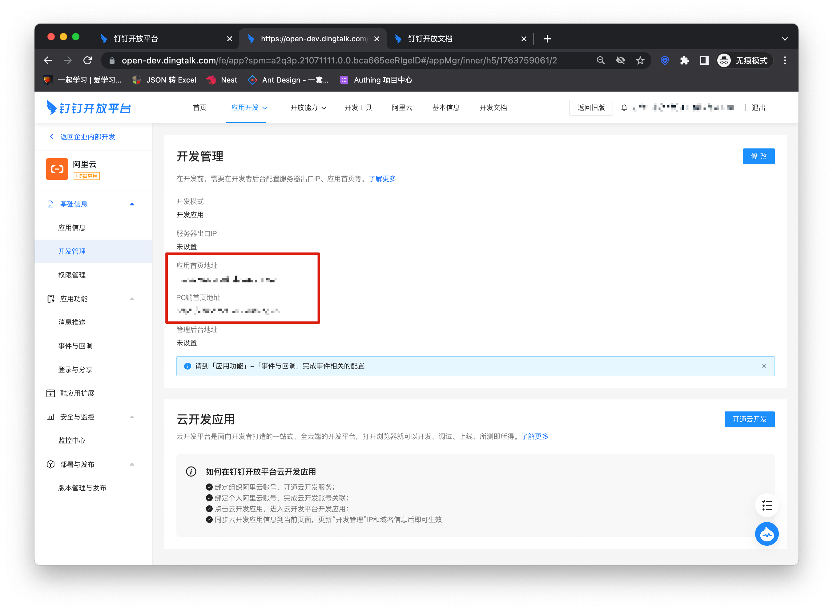 - 进入钉钉中创建的企业应用详情页,点击左边栏的「开发管理」,点击「修改」按钮,填写应用主页网页网址。后续步骤与集成应用一致进行应用发布即可。