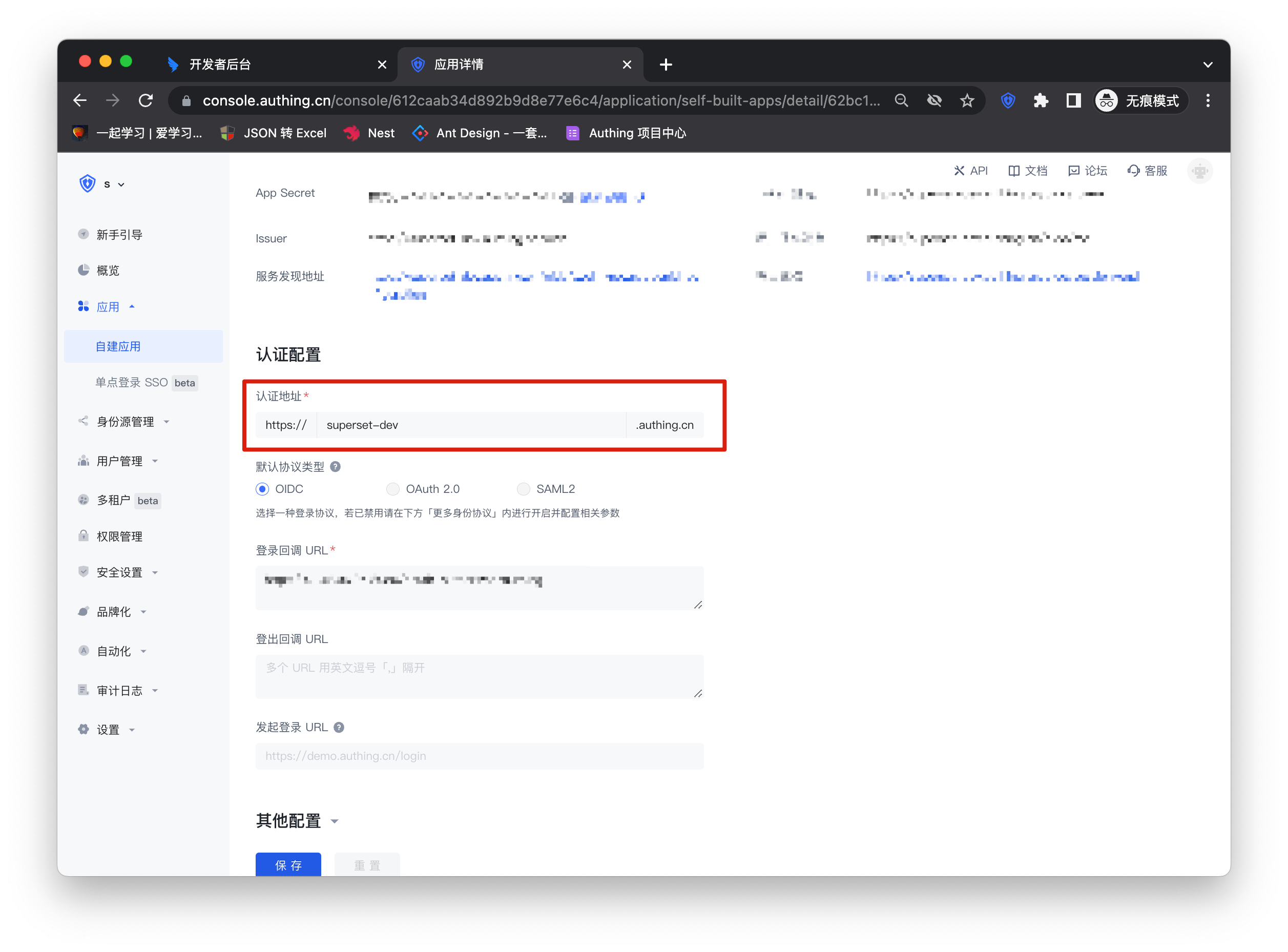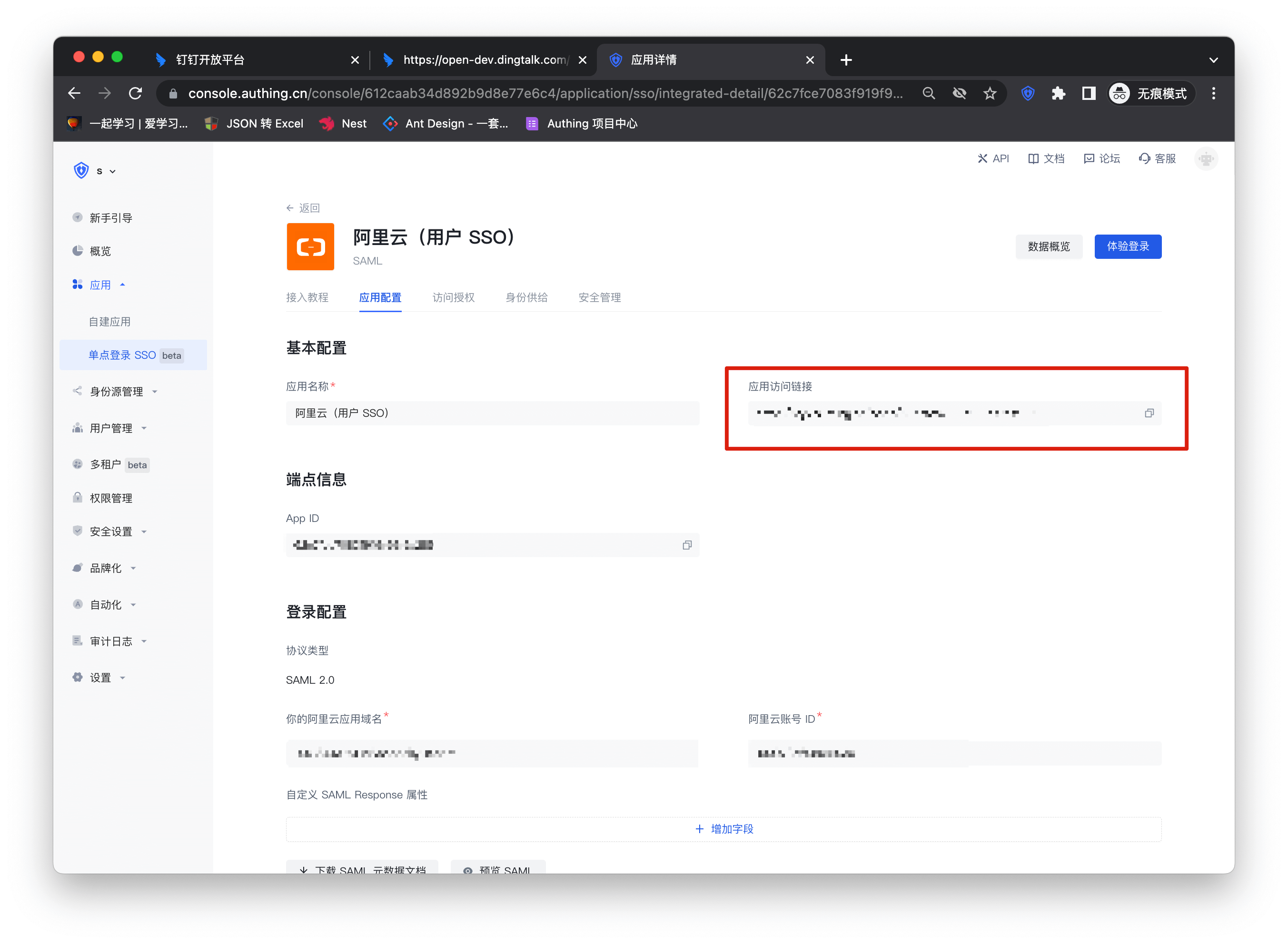 - 用户需要进入配置好的自建应用详情页,将其认证地址进行复制