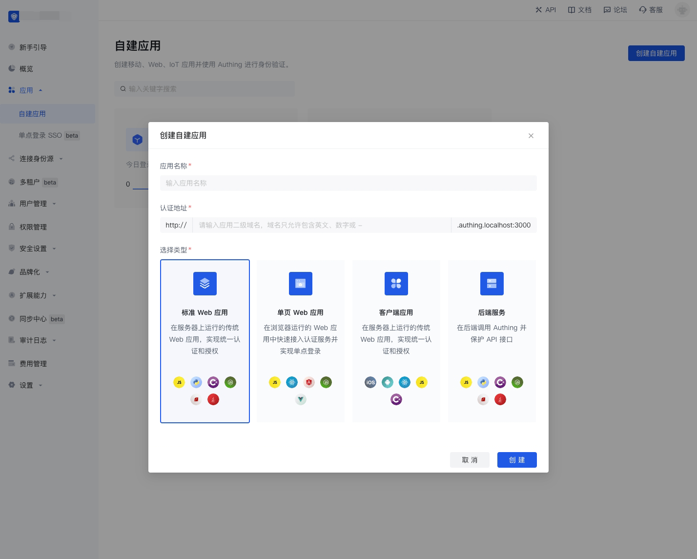 为了让你的应用具备身份认证能力,你需要在 Authing 创建一个应用,名称建议填写你的实际应用项目的名称,进入控制台 > 应用 > 应用列表,点击创建应用: