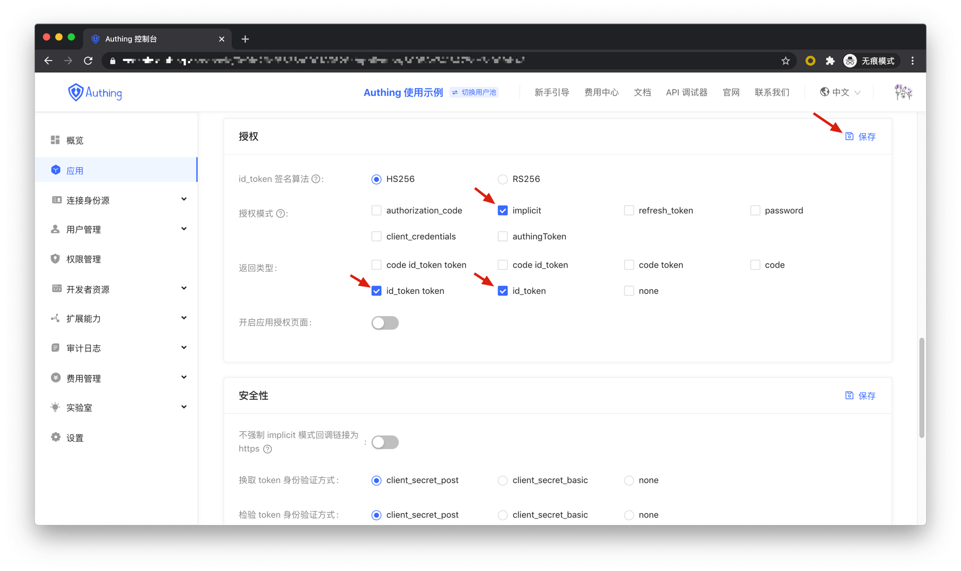 首先在控制台 > 应用,找到你的应用,进入应用详情,在下方的「授权」卡片中,授权模式中勾选 implicit,返回类型中勾选 id_token token 和 id_token,然后点击保存。