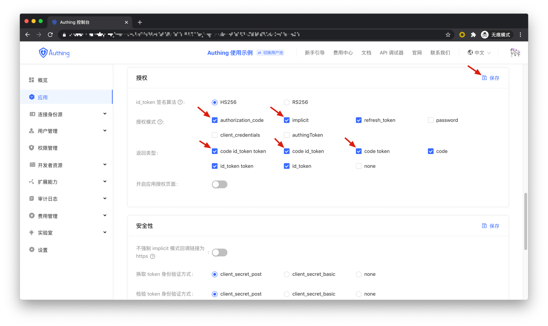 首先在控制台 > 应用,找到你的应用,进入应用详情,在下方的「授权」卡片中,授权模式中勾选 authorization_code 和 implicit,返回类型中勾选 code id_token token、code id_token 和 code token,然后点击保存。