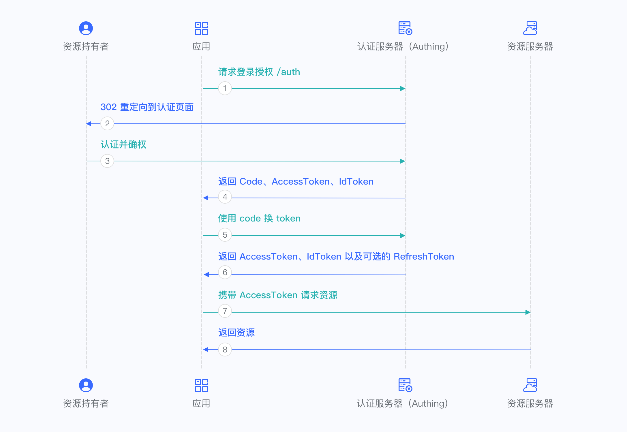 - 你的应用服务将授权码发送到 Authing 获取 AccessToken 和 IdToken,如果需要,还会返回 refresh token。