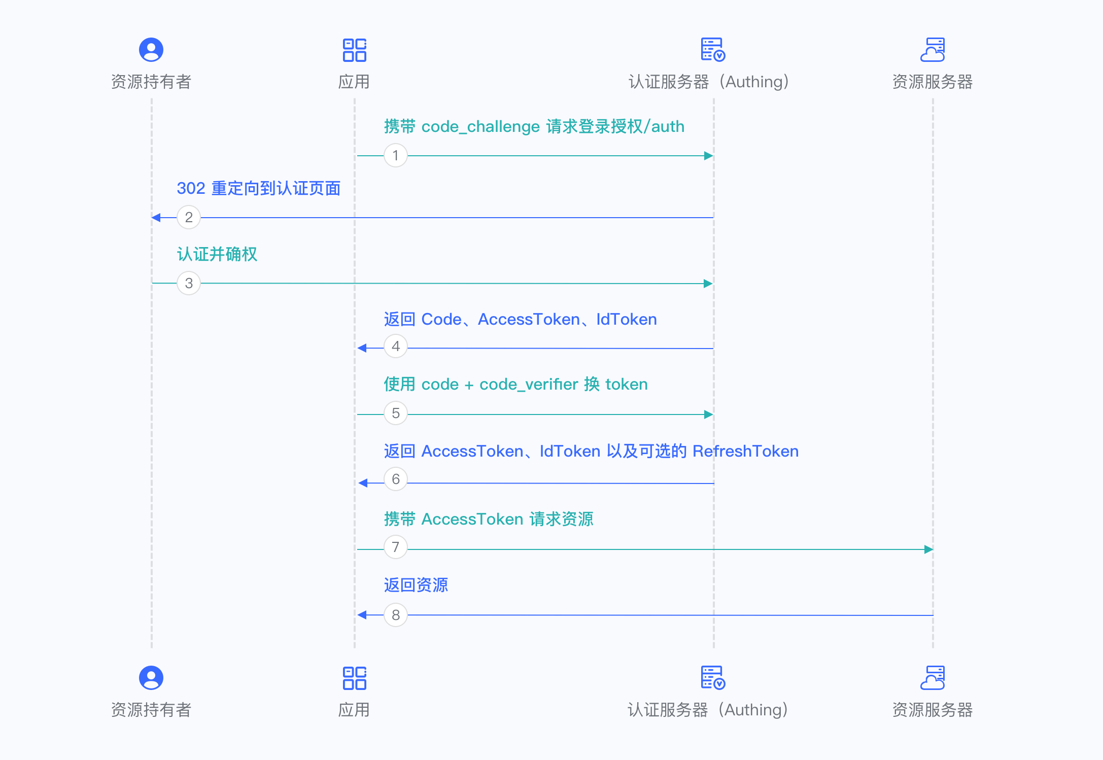 - 你的应用将授权码和校验码发送到 Authing 获取 AccessToken 和 IdToken,如果需要,还会返回 Refresh token。