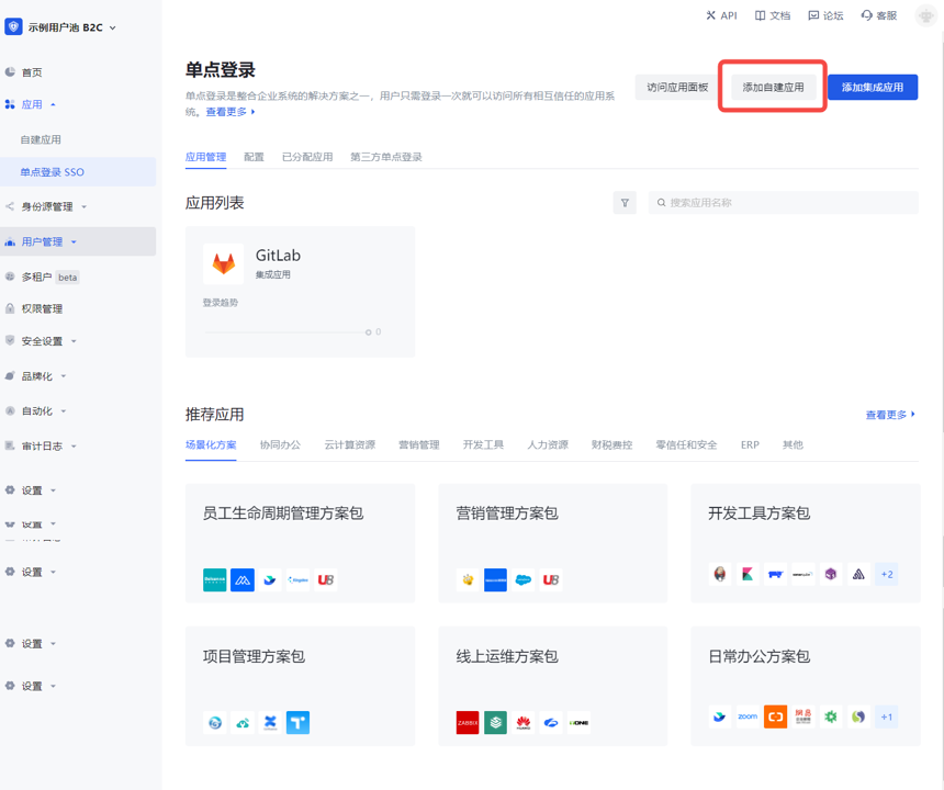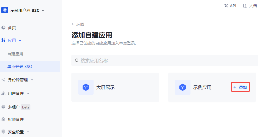 - 用户进入 应用->单点登录 SSO,点击页面右上角 添加自建应用。