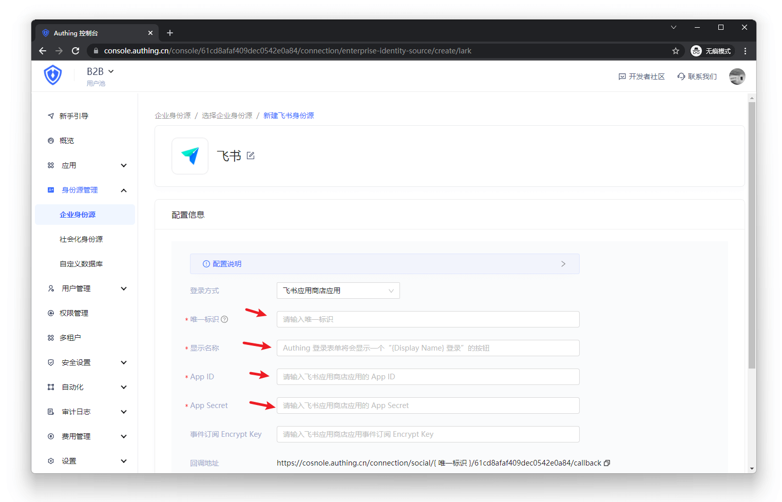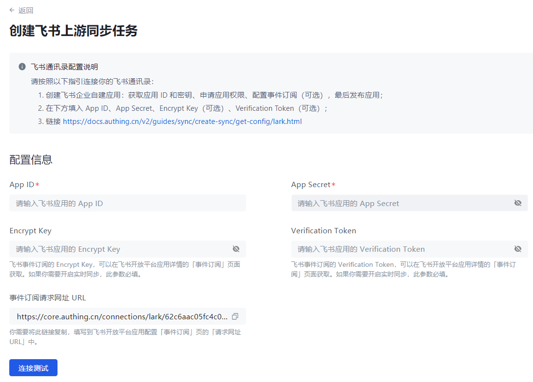 - 在 Authing 中配置飞书通讯录,并按要求填入以下信息。