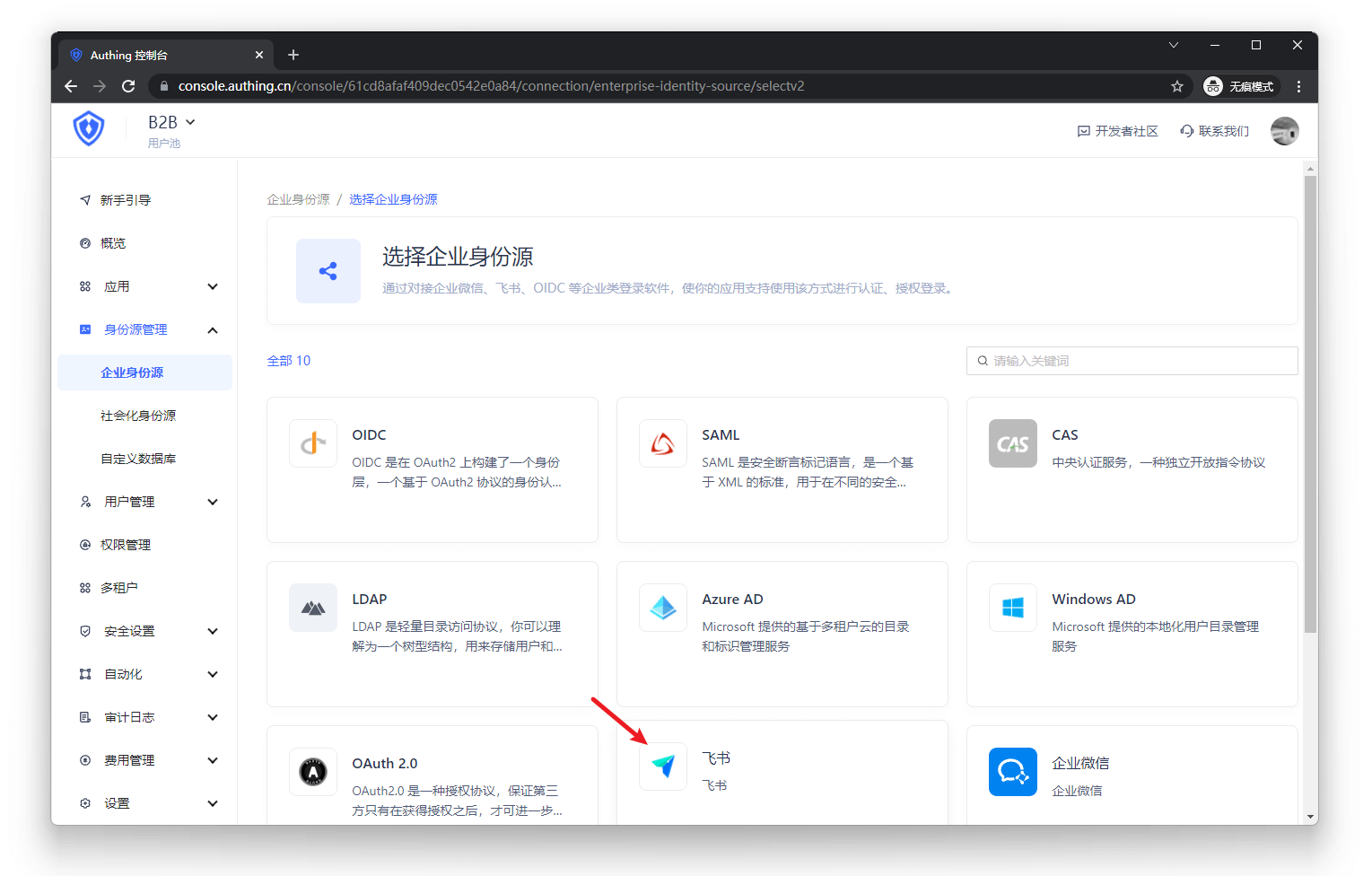 ¶ 第一步:以飞书为例,将飞书配置为单一身份源