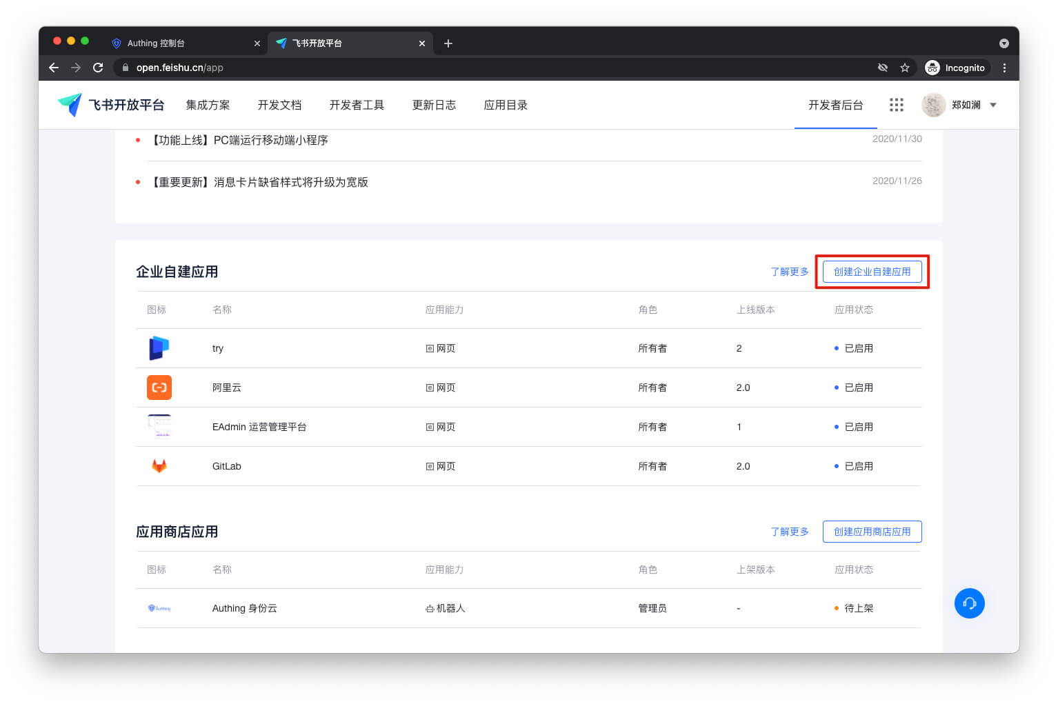 - 进入 飞书开放平台 (opens new window),点击「创建企业自建应用」。