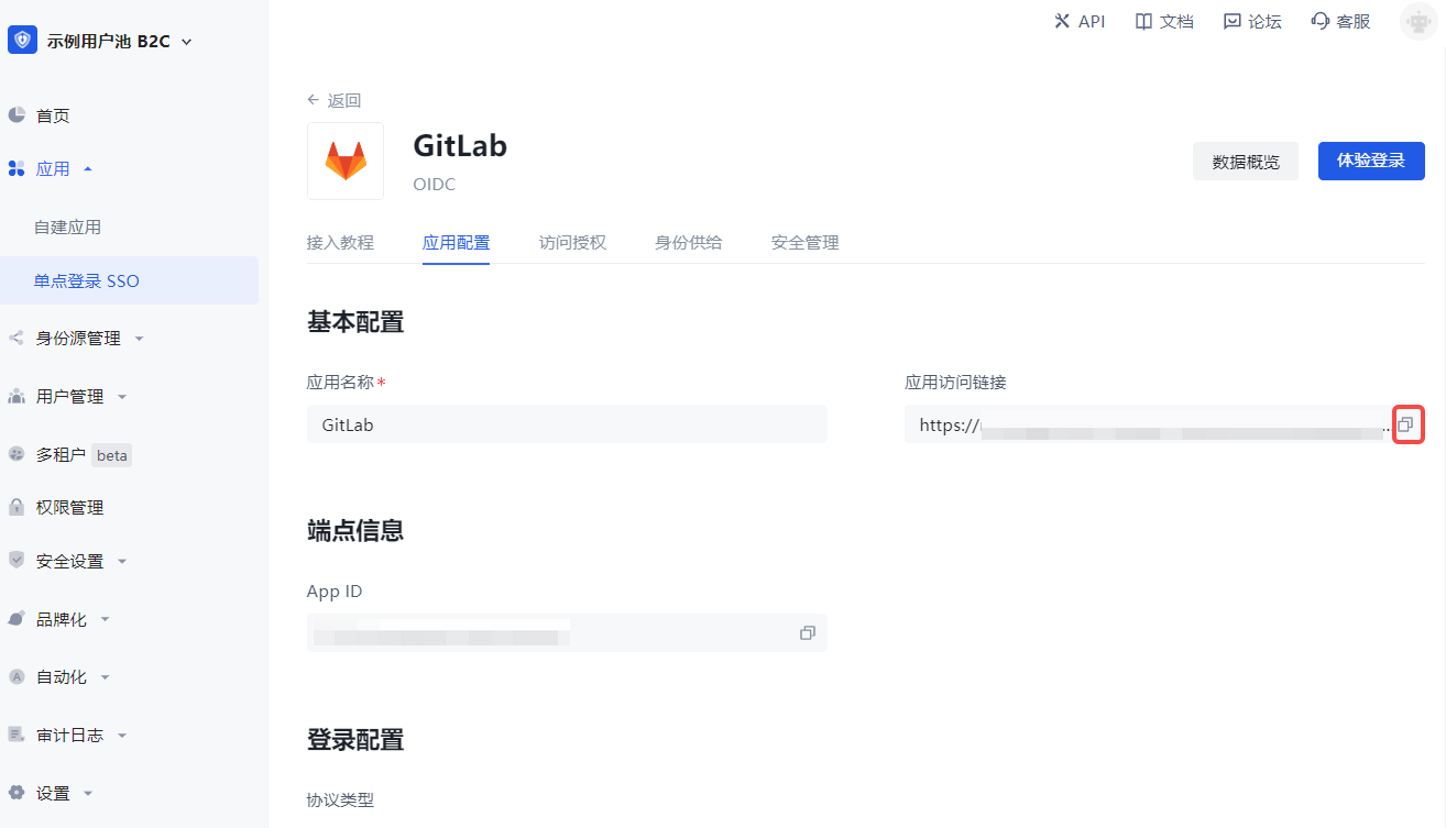- 进入 Authing 控制台 应用->单点登录 SSO,点击页面右上角 添加集成应用,获取 GitLab。复制 应用配置 下 应用访问链接。