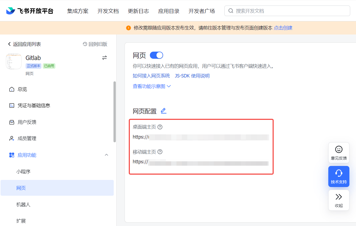 - 进入飞书开放平台 应用功能->网页,打开 启用网页 开关,并粘贴链接至 网页配置,点击 保存。