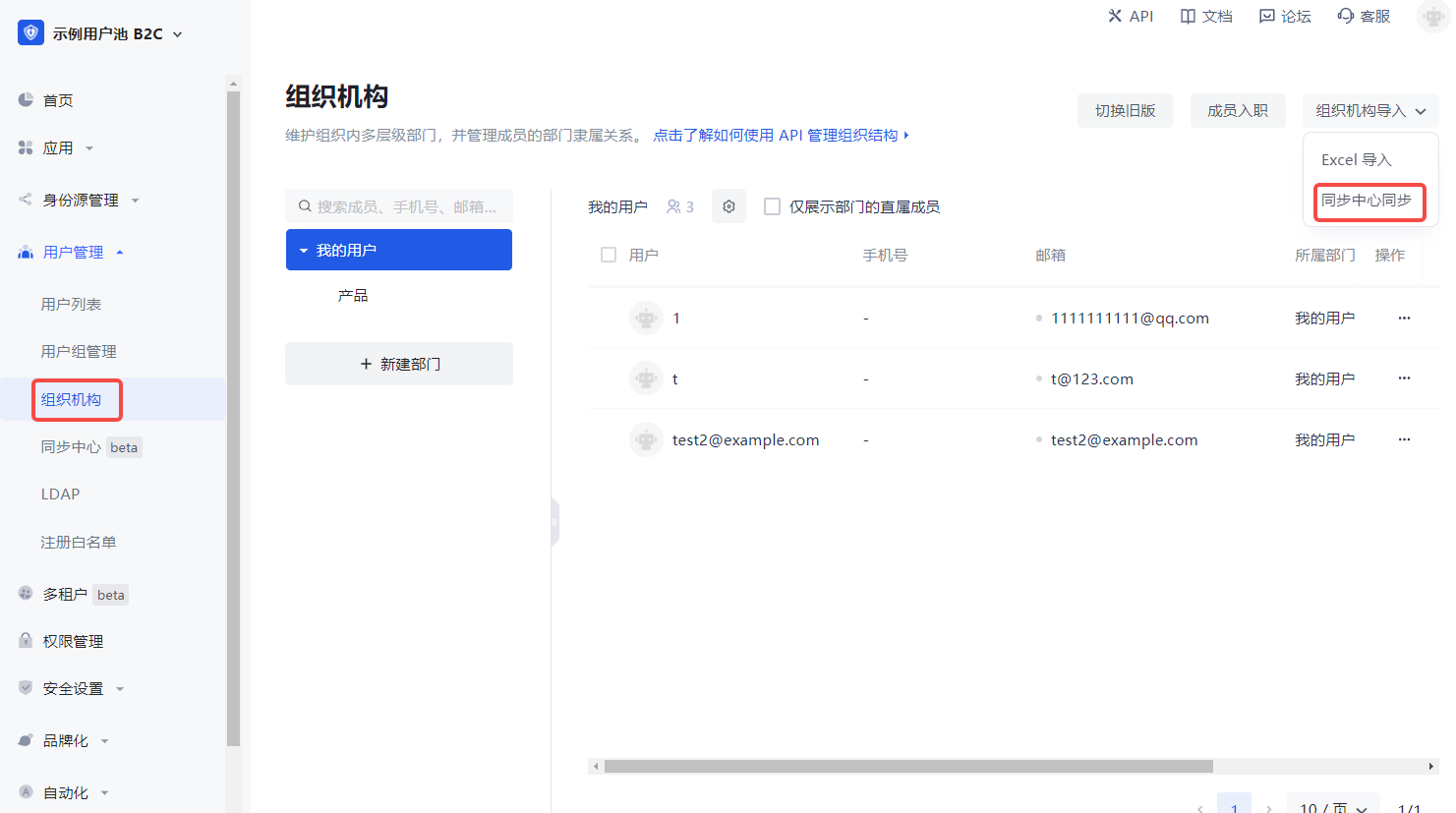 在 Authing 控制台 用户管理->组织机构 页面点击右上角 组织机构导入->同步中心同步,创建飞书上游同步。此后,飞书的增删减改操作将实时同步到控制台的组织机构中。