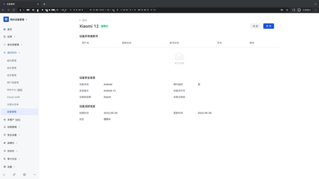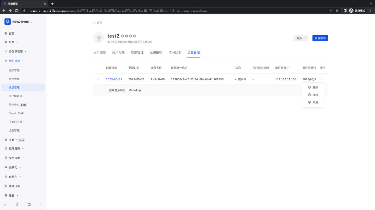 - 点击「组织机构」-「成员管理」-「成员详情」页面,用户可以看到使用该账户登录的所有设备信息,并且可以进行移除、挂起、停用操作;