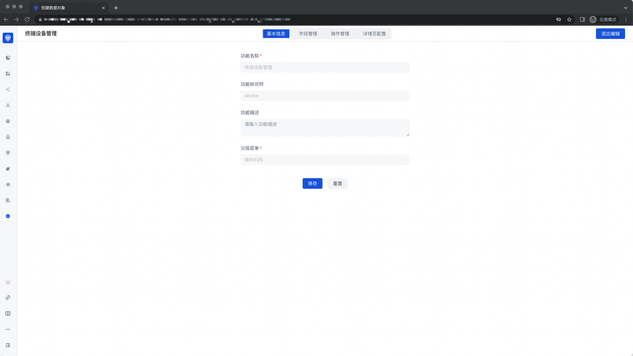 - 「终端设备管理」功能的基本信息里,展示定义好的功能名称、功能标识符、功能描述及父级菜单,且无法修改: