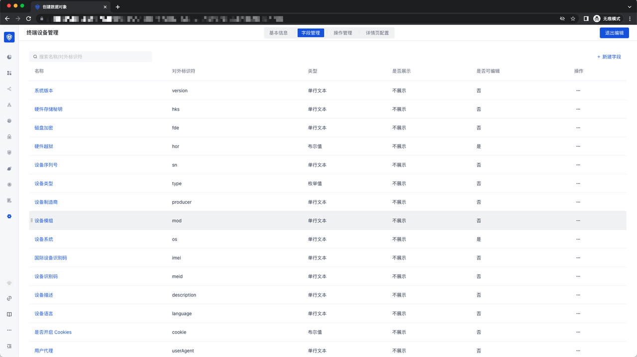 - 字段管理 : 展示所有的和设备管理功能相关的字段,可以选择是否展示、是否可编辑:
