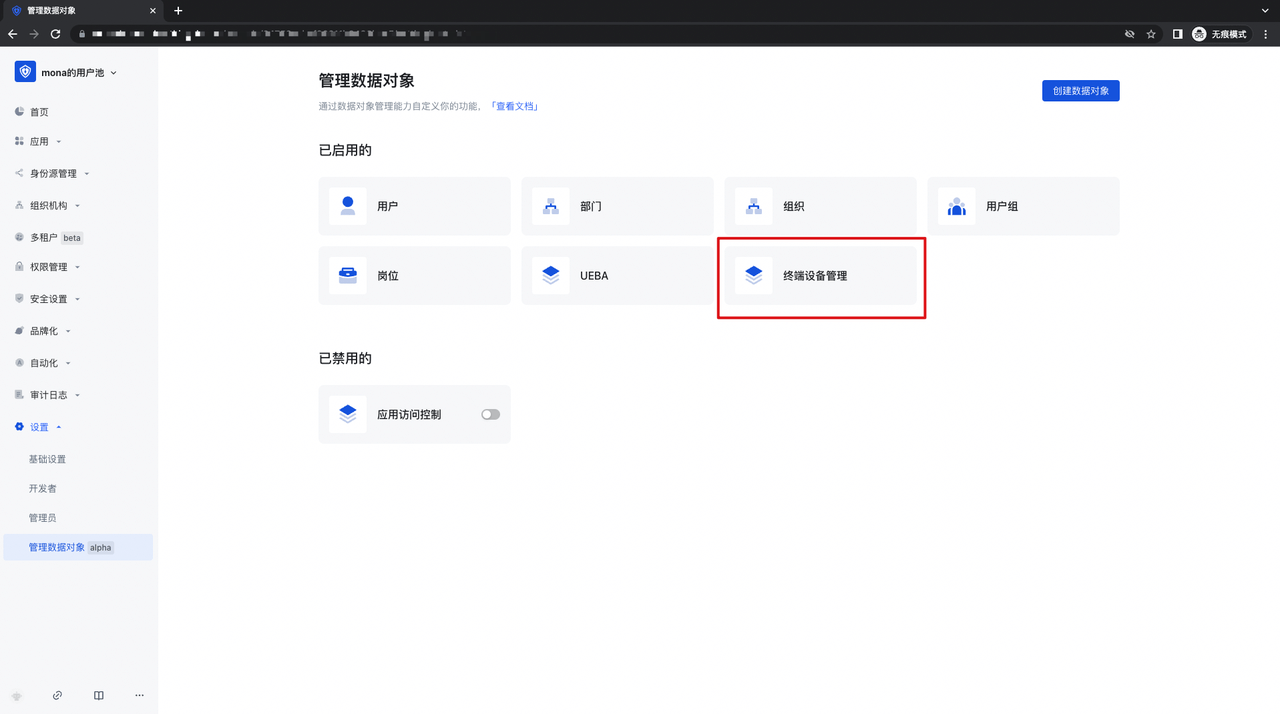 - 首先,在一个开启「管理数据对象」功能的用户池里,打开「设置」-「管理数据对象」页面,点击「终端设备管理」模块,进入终端设备管理模块: