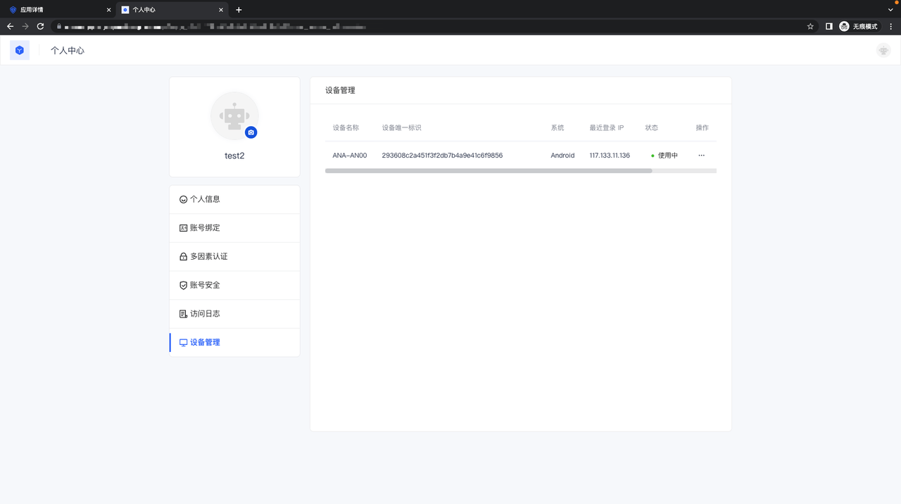- Web 端应用个人中心:在 Web 端应用的个人中心,可以看到该用户下,所有登录了该应用的设备;