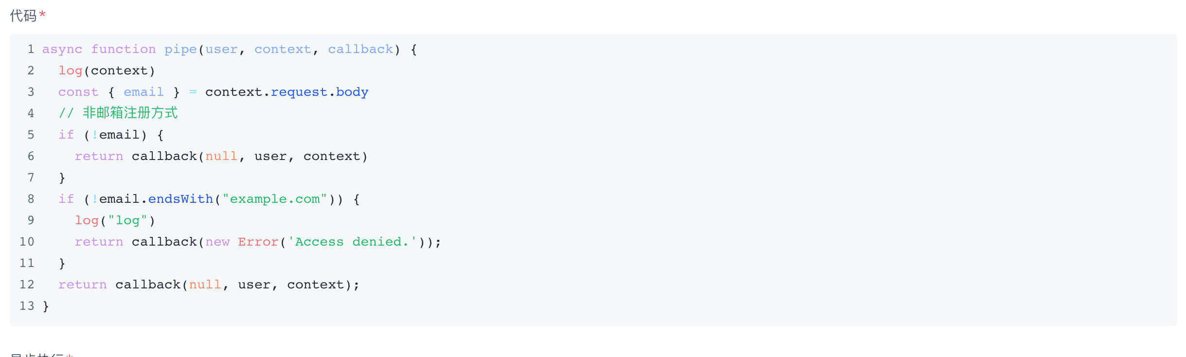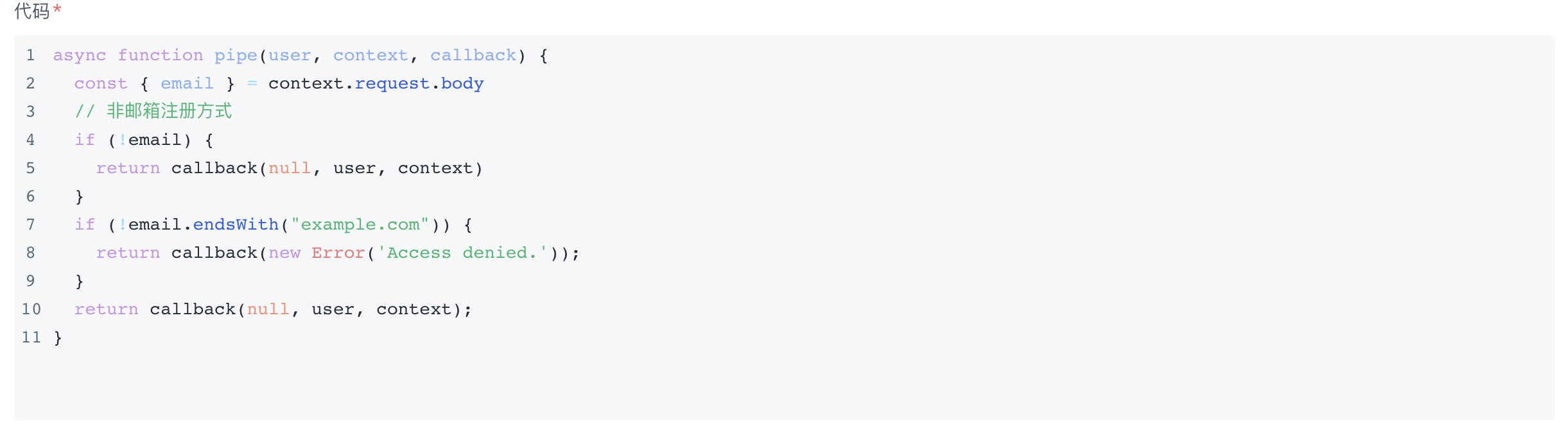 该 Pipeline 函数的作用是只允许域名后缀为example.com的邮箱注册。