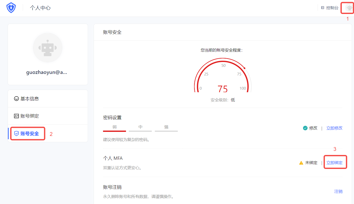 b. 选择 个人中心->账号安全->个人 MFA,点击 立即绑定 按钮绑定 MFA。