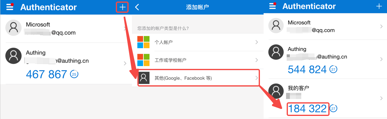b. 在手机端下载并打开 Google Authenticator / Microsoft Authenticator APP(下文以 Microsoft Authenticator 为例添加 MFA。),点击右上角 + 按钮,选择 其他(Google、Facebook 等), 扫码添加 MFA。