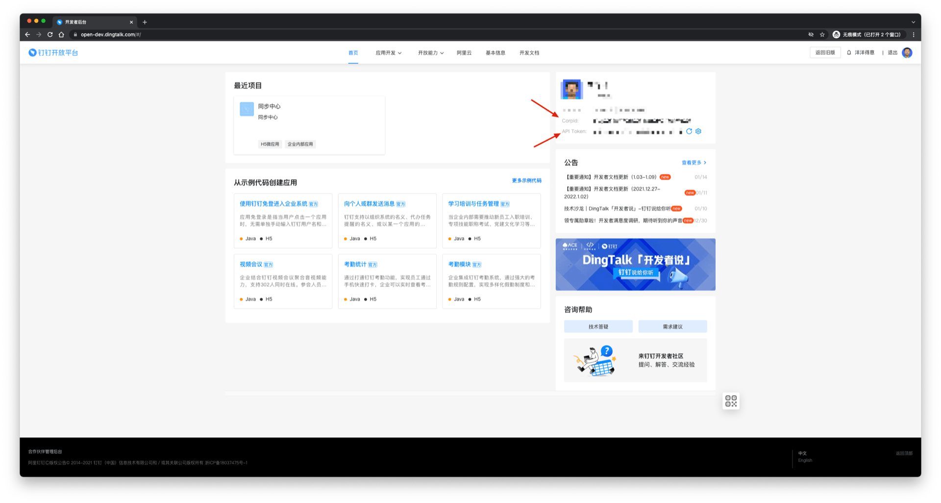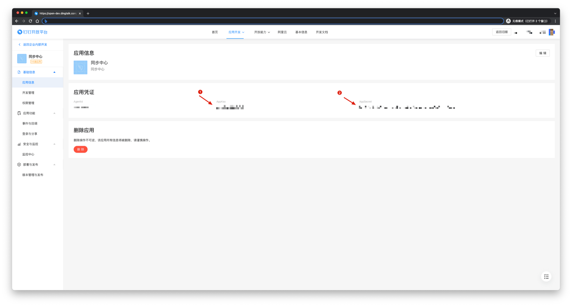 - 在 应用开发 页面创建一个应用,然后进入应用详情,获取 AppKey 和 AppSecret。