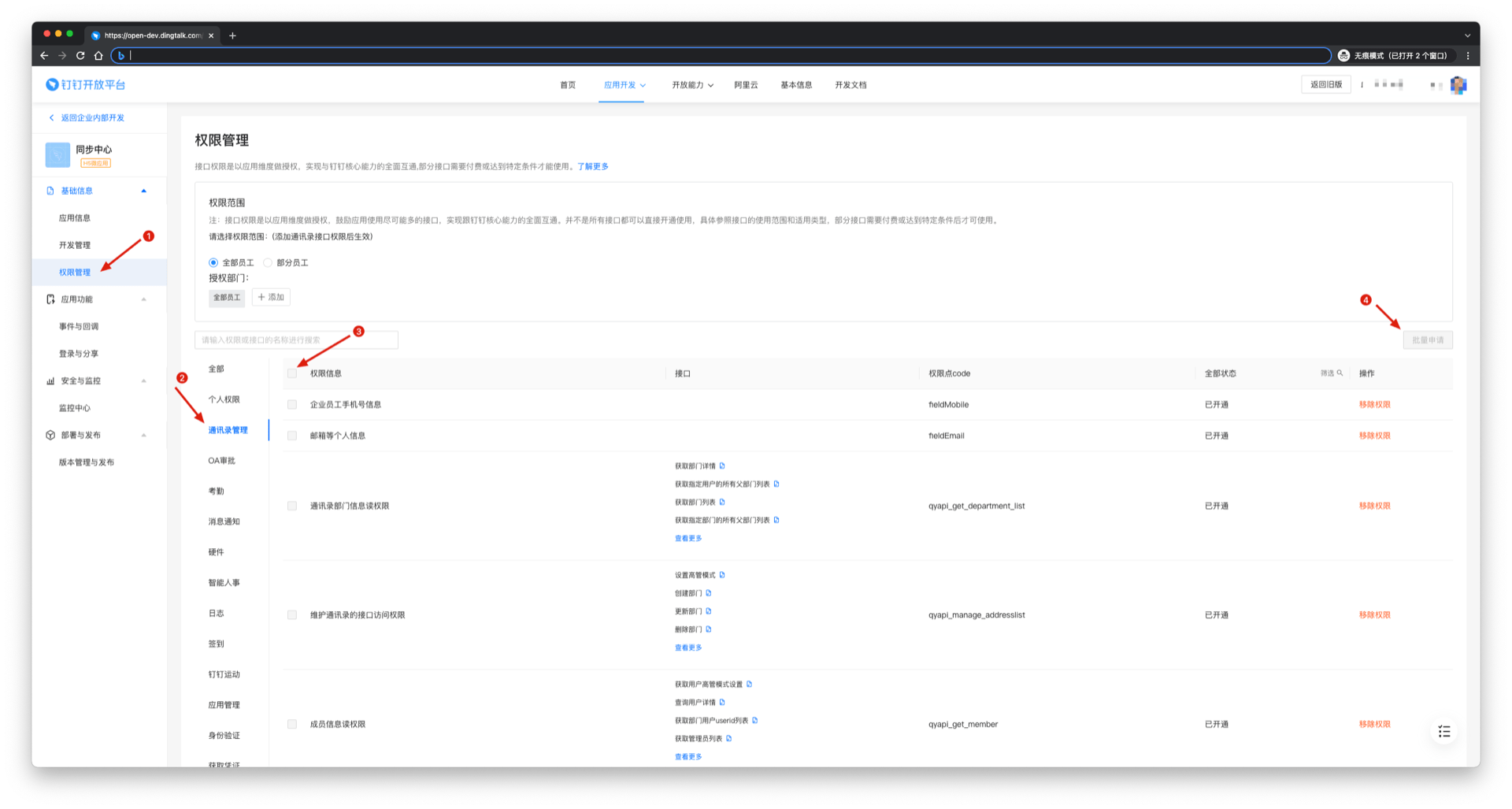 - 进入 权限管理,申请 通讯录管理 所有权限,如果不需要实时同步,到这里就可以得到所需参数和权限了。