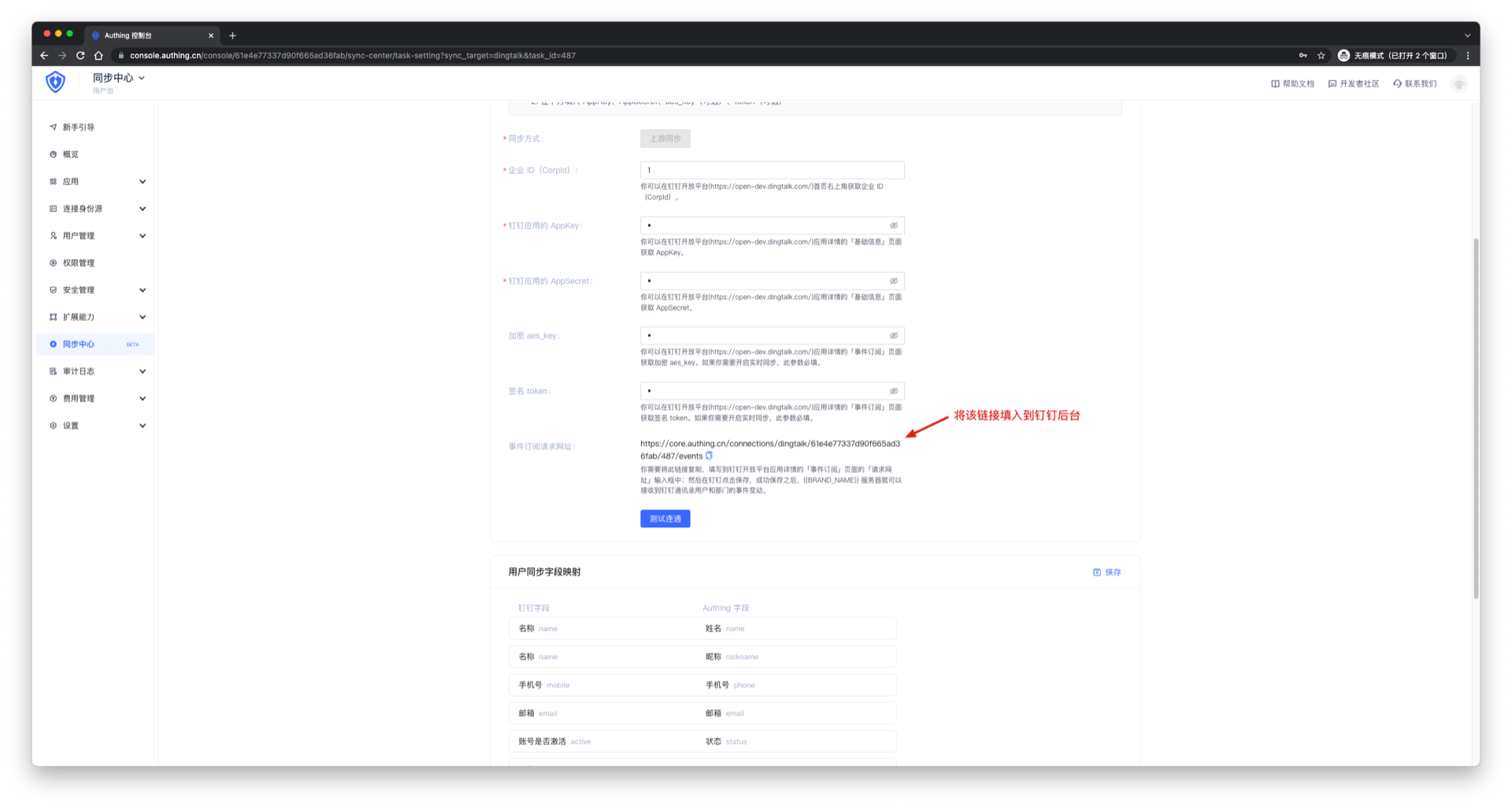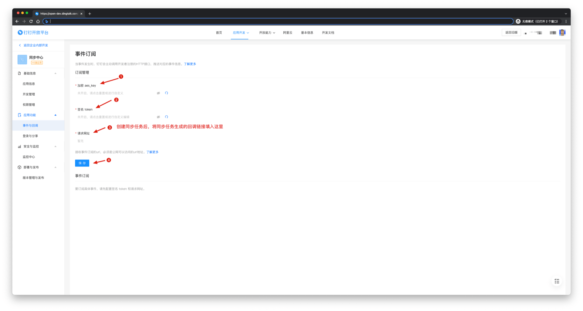 - 将所有参数填入配置,创建一个同步任务,得到一个接收事件 URL,将该 Url 填入上图步骤三位置。