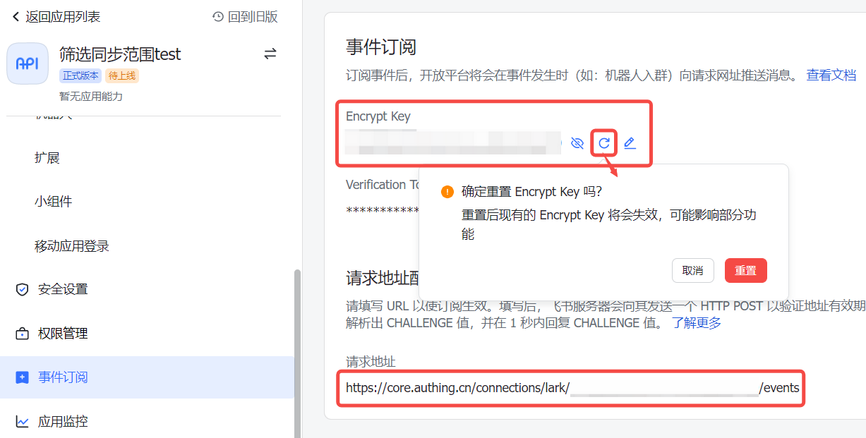 如果飞书开放平台 事件订阅 处显示 Encrypt Key 未开启,点击重置按钮生成新值,或者点击编辑按钮自定义。需要注意的是,重置 Encrypt Key,则现有值会失效,可能影响部分功能。