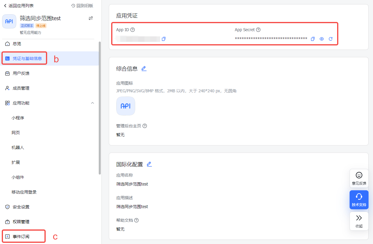 b. 点击左侧导航栏 凭证与基础信息 菜单获取 App ID 和 App Secret。