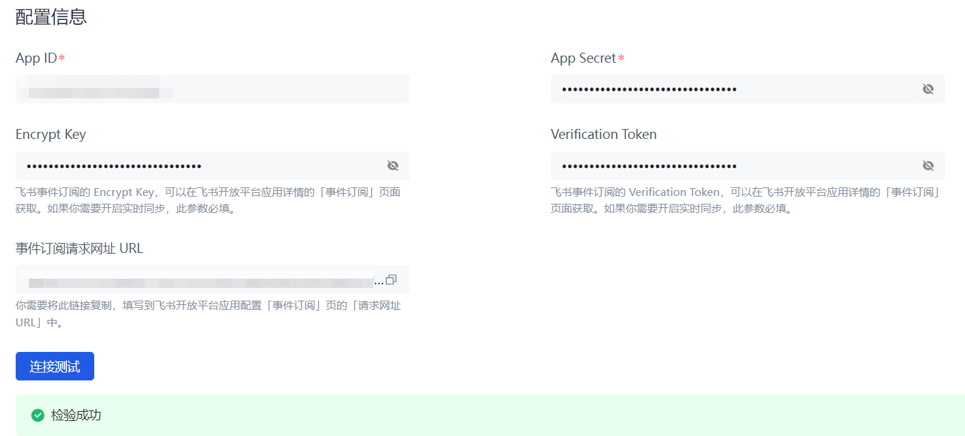 - 获取 App ID、App Secret 和 Encrypt Key、Verification Token(后两者用于上游实时同步)。