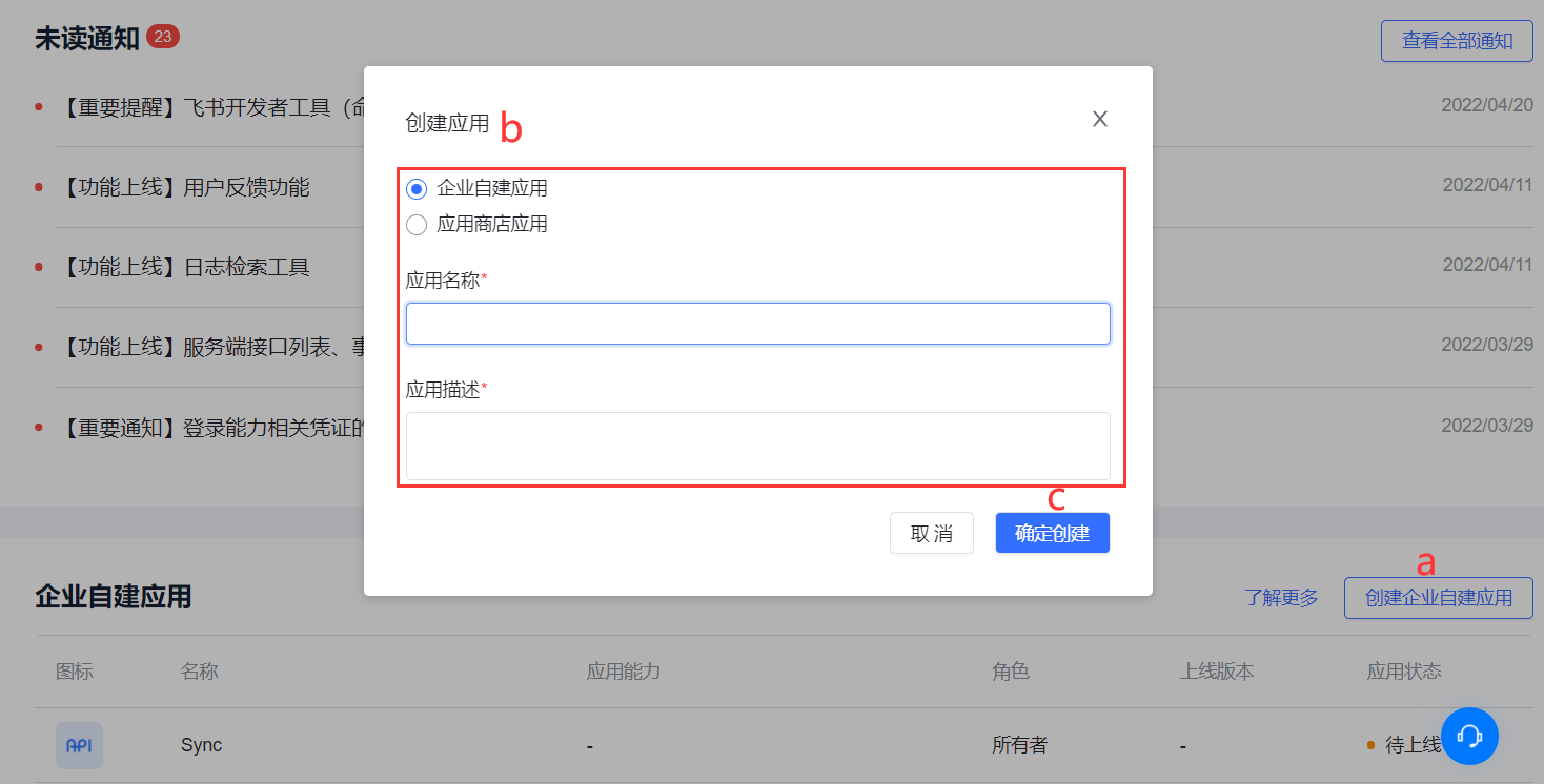 b. 选择 企业自建应用 选项,自定义 应用名称 和 应用描述。