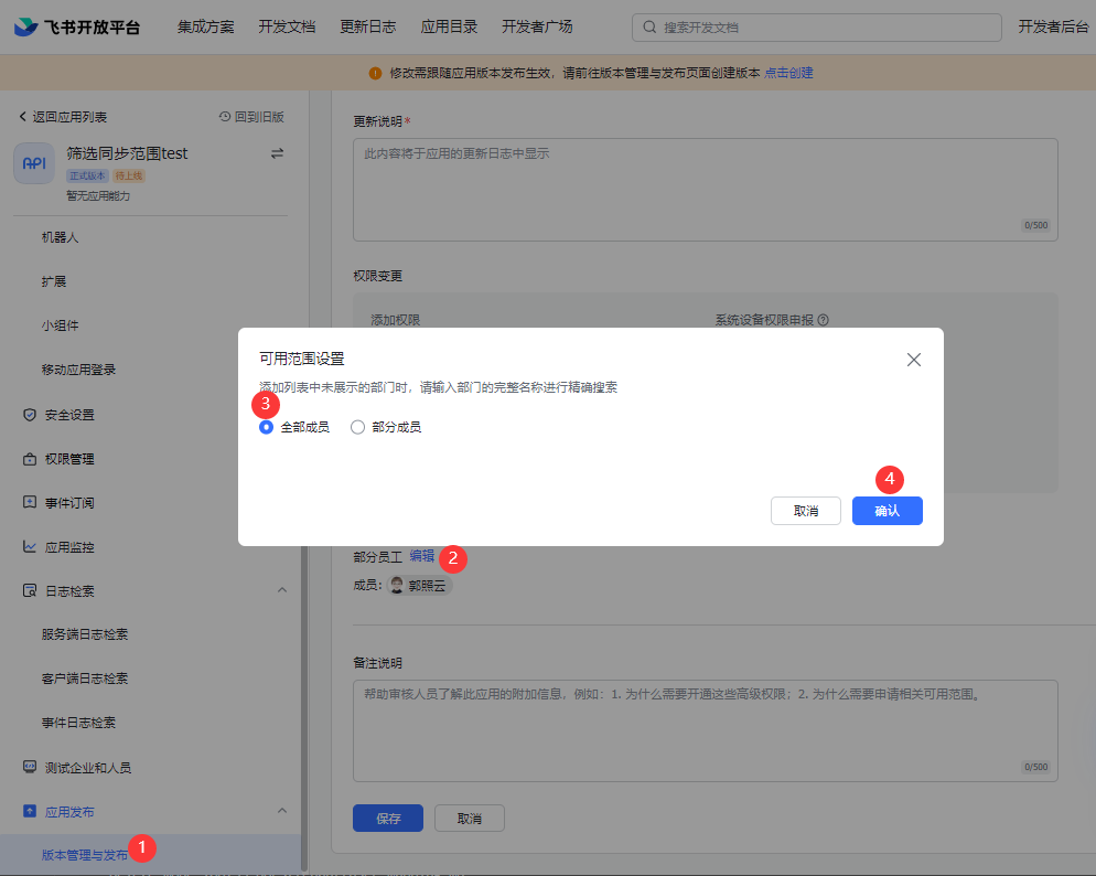 - 如果有 需审核权限,你需要发布最新版本。创建新版本时,注意 可用范围 选择 所有员工,和 通讯录权限范围 保持一致。