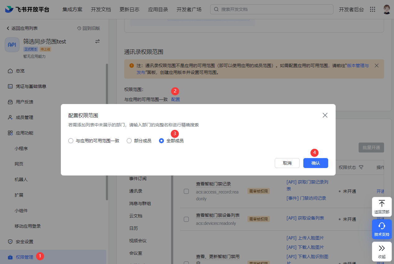 b. 在飞书应用详情的 权限管理->权限配置 选择该应用所需的权限,如: